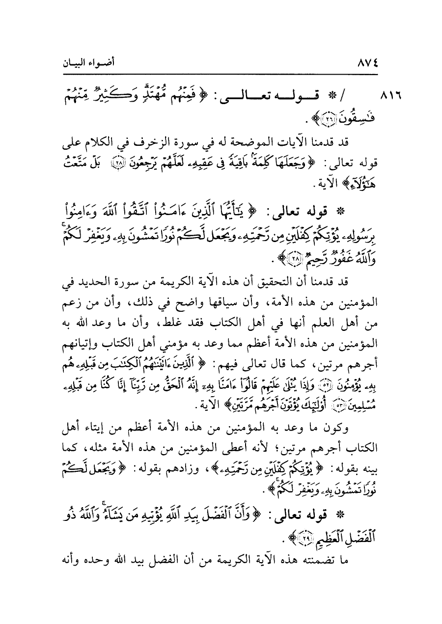 قد قدمنا أن التحقيق أن هذه الآية الكريمة من سورة الحديد في المؤمنين من هذه الأمة، وأن سياقها واضح في ذلك، وأن من زعم من أهل العلم أنها في أهل الكتاب فقد غلط، وأن ما وعد الله به المؤمنين من هذه الأمة أعظم مما وعد به مؤمني أهل الكتاب وإتيانهم أجرهم مرتين، كما قال تعالى فيهم: {الَّذِينَ آتَينَاهُمُ الْكِتَابَ مِنْ قَبْلِهِ هُمْ بِهِ يُؤْمِنُونَ (٥٢) وَإِذَا يُتْلَى عَلَيهِمْ قَالُوا آمَنَّا بِهِ إِنَّهُ الْحَقُّ مِنْ رَبِّنَا إِنَّا كُنَّا مِنْ قَبْلِهِ مُسْلِمِينَ (٥٣) أُولَئِكَ يُؤْتَوْنَ أَجْرَهُمْ مَرَّتَينِ} الآية.