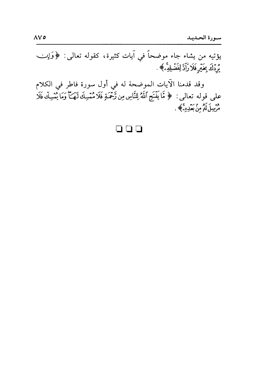 وقد قدمنا الآيات الموضحة له في أول سورة فاطر في الكلام على قوله تعالى: {مَا يَفْتَحِ اللَّهُ لِلنَّاسِ مِنْ رَحْمَةٍ فَلَا مُمْسِكَ لَهَا وَمَا يُمْسِكْ فَلَا مُرْسِلَ لَهُ مِنْ بَعْدِهِ}.