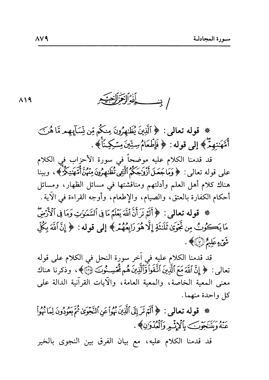 • قوله تعالى: {أَلَمْ تَرَ أَنَّ اللَّهَ يَعْلَمُ مَا فِي السَّمَاوَاتِ وَمَا فِي الْأَرْضِ مَا يَكُونُ مِنْ نَجْوَى ثَلَاثَةٍ إلا هُوَ رَابِعُهُمْ} إلى قوله: {إِنَّ اللَّهَ بِكُلِّ شَيءٍ عَلِيمٌ (٧)}.