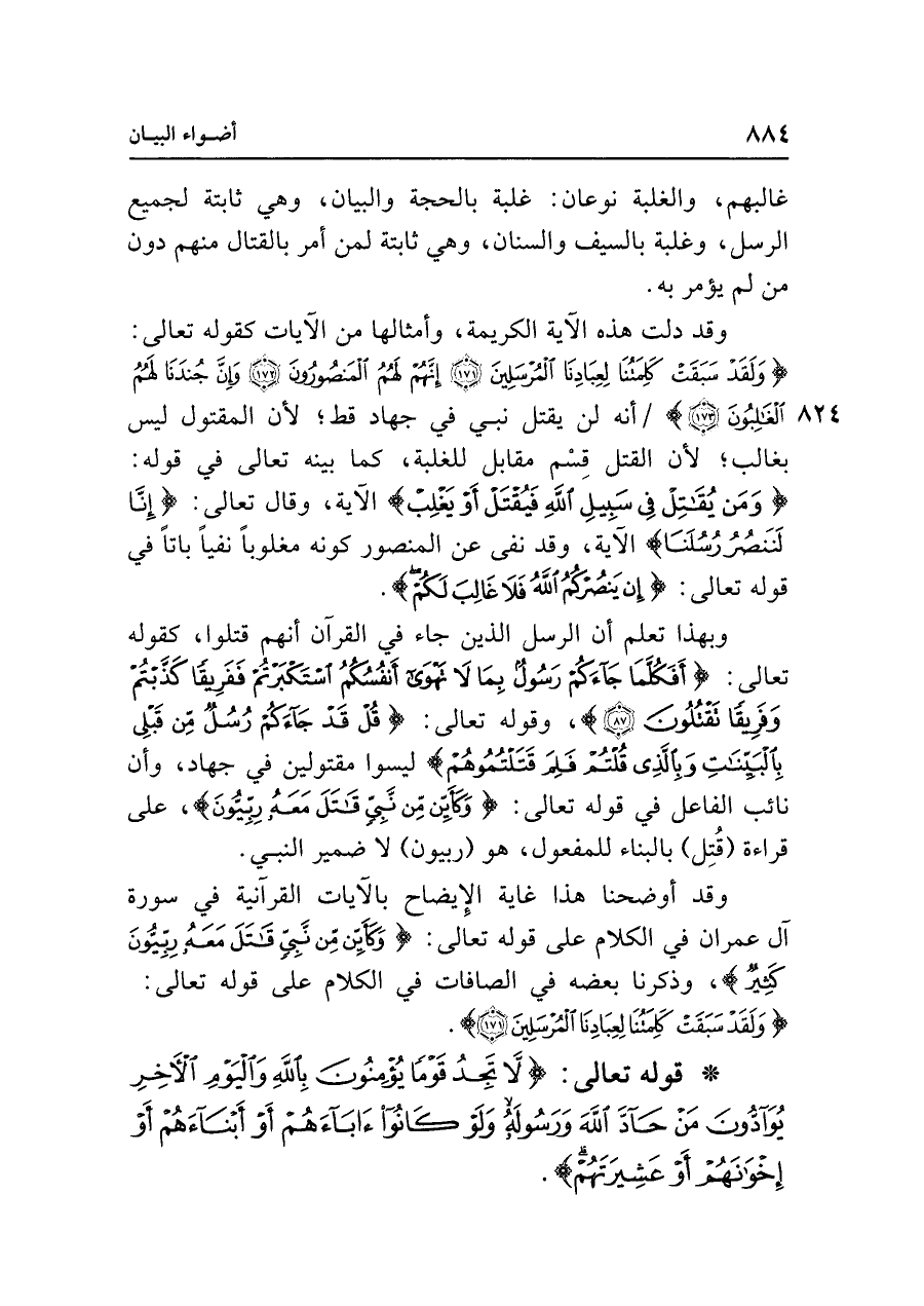 وقد أوضحنا هذا غاية الإِيضاح بالآيات القرآنية في سورة آل عمران في الكلام على قوله تعالى: {وَكَأَيِّنْ مِنْ نَبِيٍّ قَاتَلَ مَعَهُ رِبِّيُّونَ كَثِيرٌ}، وذكرنا بعضه في الصافات في الكلام على قوله تعالى: {وَلَقَدْ سَبَقَتْ كَلِمَتُنَا لِعِبَادِنَا الْمُرْسَلِينَ (١٧١)}.
