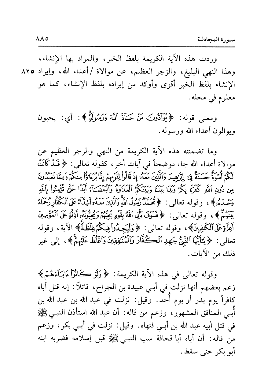 وقوله تعالى في هذه الآية الكريمة: {لَوْ كَانُوا آبَاءَهُمْ} زعم بعضهم أنها نزلت في أبي عبيدة بن الجراح، قائلًا: إنه قتل أباه كافرًا يوم بدر أو يوم أُحد. وقيل: نزلت في عبد الله بن عبد الله بن أُبي المنافق المشهور، وزعم من قاله: أن عبد الله استأذن النبي - صلى الله عليه وسلم - في قتل أبيه عبد الله بن أبي فنهاه. وقيل: نزلت في أبي بكر، وزعم من قاله: أن أباه أبا قحافة سب النبي - صلى الله عليه وسلم - قبل إسلامه فضربه ابنه أبو بكر حتى سقط.