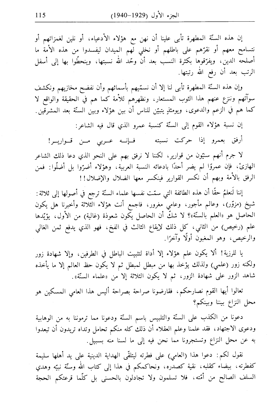 نقول لكم: دعوا هذا (العامي) على فطرته ليتلقّى الهداية الدينية على يد أهلها سليمة كفطرته، بيضاء كقلبه، نقية كصدره، ونحاكمكم في هذا إلى كتاب الله وسنّة نبيّه وهدي السلف الصالح من أمّته، فلا تسلمون ولا تجادلون بالحسنى بل كلّما قرعتكم الحجة