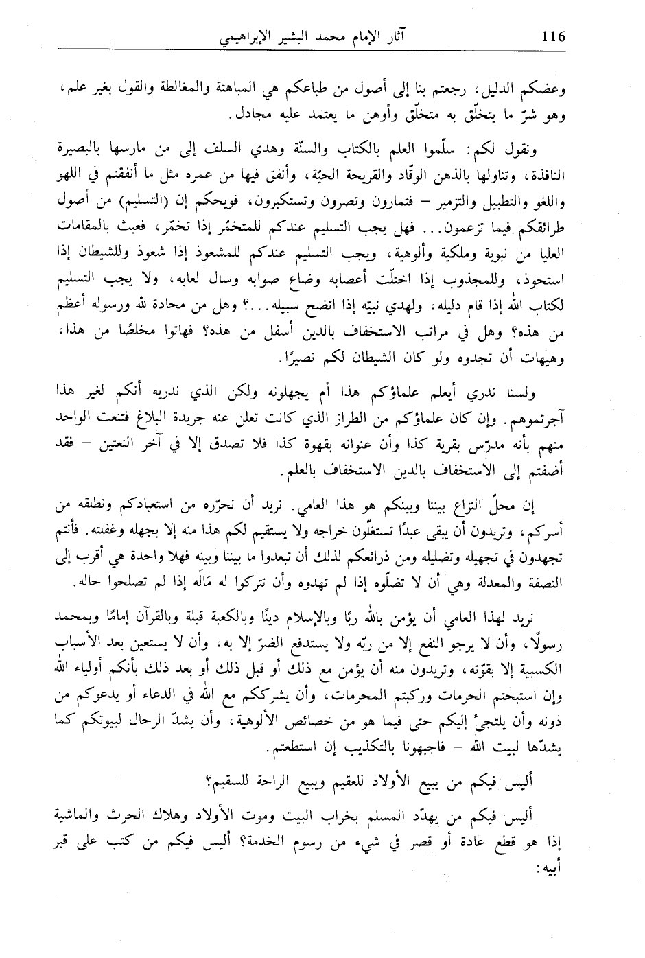 ونقول لكم: سلّموا العلم بالكتاب والسنّة وهدي السلف إلى من مارسها بالبصيرة النافذة، وتناولها بالذهن الوقاد والقريحة الحيّة، وأنفق فيها من عمره مثل ما أنفقتم في اللهو واللغو والتطبيل والتزمير- فتمارون وتصرون وتستكبرون، فويحكم إن (التسليم) من أصول طرائقكم فيما تزعمون … فهل يجب التسليم عندكم للمتخمّر إذا تخمّر، فعبث بالمقامات العليا من نبوية وملكية وألوهية، ويجب التسليم عندكم للمشعوذ إذا شعوذ وللشيطان إذا استحوذ، وللمجذوب إذا اختلّت أعصابه وضاع صوابه وسال لعابه، ولا يجب التسليم لكتاب الله إذا قام دليله، ولهدي نبيّه إذا اتضح سبيله…؟ وهل من محادة لله ورسوله أعظم من هذه؟ وهل في مراتب الاستخفاف بالدين أسفل من هذه؟ فهاتوا مخلصًا من هذا، وهيهات أن تجدوه ولو كان الشيطان لكم نصيرًا.