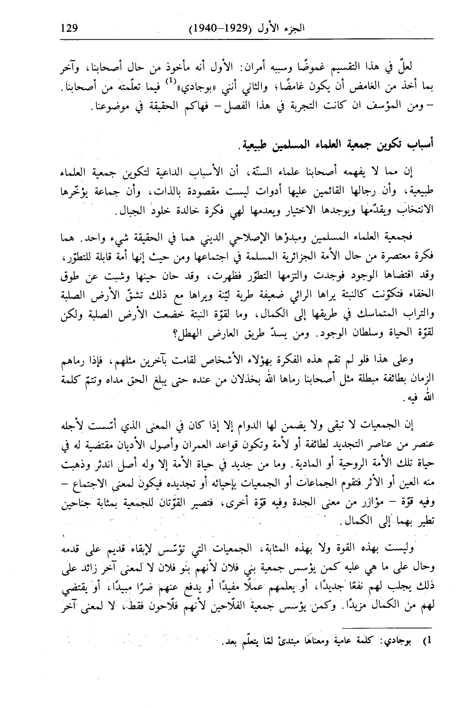 فجمعية العلماء المسلمين ومبدؤها الإصلاحي الديني هما في الحقيقة شيء واحد. هما فكرة معتصرة من حال الأمة الجزائرية المسلمة في اجتماعها ومن حيث إنها أمة قابلة للتطوّر، وقد اقتضاها الوجود فوجدت والتزمها التطوّر فظهرت، وقد حان حينها وشبت عن طوق الخفاء فتكوّنت كالنبتة يراها الرائي ضعيفة طرية ليّنة ويراها مع ذلك تشقّ الأرض الصلبة والتراب المتماسك في طريقها إلى الكمال، وما لقوّة النبتة خضعت الأرض الصلبة ولكن لقوّة الحياة وسلطان الوجود. ومن يسدّ طريق العارض الهطل؟