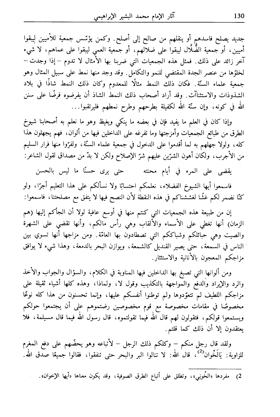جديد يصلح فاسدهم أو ينقلهم من صالح إلى أصلح. وكمن يؤسّس جمعية للأميين ليبقوا أميين، أو جمعية الضُّلَّال ليبقوا على ضلالهم، أو جمعية العمي ليبقوا على عماهم، لا شيء آخر زائد على ذلك. فمثل هذه الجمعيات التي ضربنا بها الأمثال لا تدوم- إذا وجدت- لخلوّها من عنصر الجدة المقتضي للنمو والتكامل. وقد وجد منها نمط على سبيل المثال وهو جمعية علماء السنّة. فكان ذلك النمط مثالًا للمعدوم وكان ذلك النمط شاذًا في بلاد الشذوذات والاستثناآت. وقد أراد أصحاب ذلك النمط الشاذ أن يفرضوه فرضًا على سنن الله في كونه، وإن سنّة الله لكفيلة بطرحهم وطرح نمطهم فليرتقبوا ...