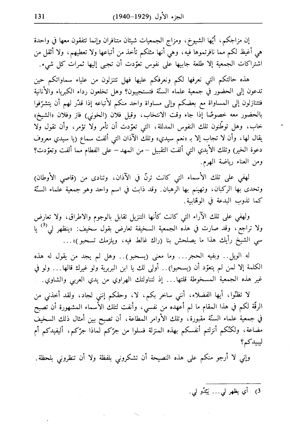 ولهفي على تلك الآراء التي كانت كأنها التنزيل تقابل بالوجوم والاطراق، ولا تعارض ولا تراجع، وقد صارت في هذه الجمعية السخيفة تعارض بقول سخيف: "ينظهر لي (3) يا سي الشيخ رأيك هذا ما يصلحش بنا (راك غالط فيه، ويلزمك تسحبو) " ...