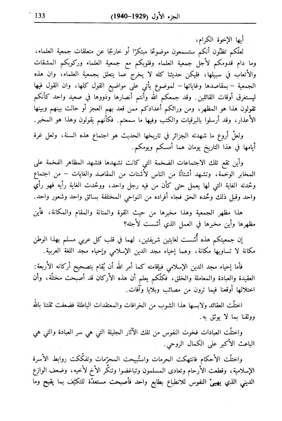 لعلّكم تظنون أنكم ستسمعون موضوعًا مبتكرًا أو خارجًا عن متعلقات جمعية العلماء، وما دام قدومكم لأجل جمعية العلماء وقلوبكم مع جمعية العلماء وركوبكم المشقات والأتعاب في سبيلها، فليكن حديثنا كله لا يخرج عما يتعلق بجمعية العلماء، وأن هذه الجمعية- بمقاصدها وغاياتها- لموضوع يأتي على مواضيع القول كلها، وأن القول فيها ليستغرق أوقات القائلين. وقد جمعكم الله وأنتم أنصارها وذووها في صعيد واحد كأنكم تقولون هذا هو المظهر، ومن ورائكم أعدادكم ممن قعد بهم العجز أو حالت بينهم وبينها الأعذار، وقد أرسلوا بالبرقيات والكتب وفيها ما سمعتم. فكأنهم يقولون وهذا هو المخبر.