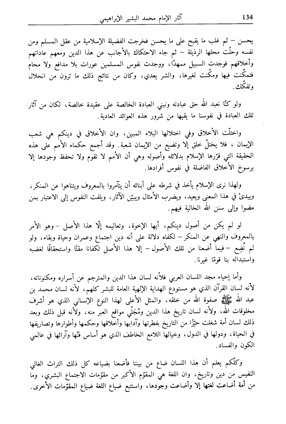 وكلّكم يعلم أن هذا اللسان ضاع من بيننا فأضعنا بضياعه كل ذلك التراث الغالي النفيس من دين وتاريخ، وأن اللغة هي المقوّم الأكبر من مقوّمات الاجتماع البشري، وما من أمة أضاعت لغتها إلا وأضاعت وجودها، واستتبع ضياع اللغة ضياع المقوّمات الأخرى.