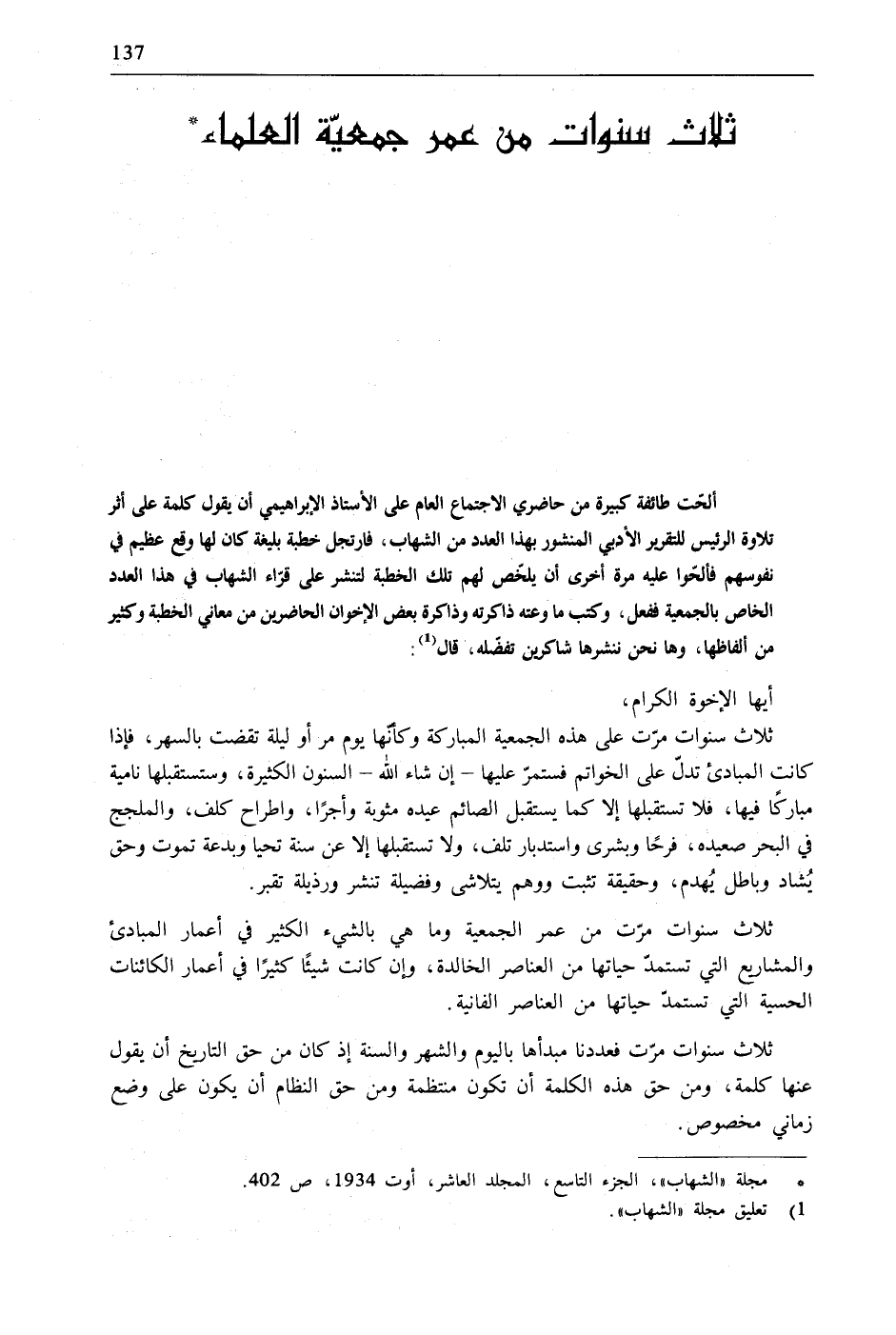 ألحّت طائفة كبيرة من حاضري الاجتماع العام على الأستاذ الإبراهيمي أن يقول كلمة على أثر تلاوة الرئيس للتقرير الأدبي المنشور بهذا العدد من الشهاب، فارتجل خطبة بليغة كان لها وقع عظيم في نفوسهم فألحّوا عليه مرة أخرى أن يلخّص لهم تلك الخطبة لتنشر على قرّاء الشهاب في هذا العدد الخاص بالجمعية ففعل، وكتب ما وعته ذاكرته وذاكرة بعض الإخوان الحاضرين من معاني الخطبة وكثير من ألفاظها، وها نحن ننشرها شاكرين تفضّله، قال (1):