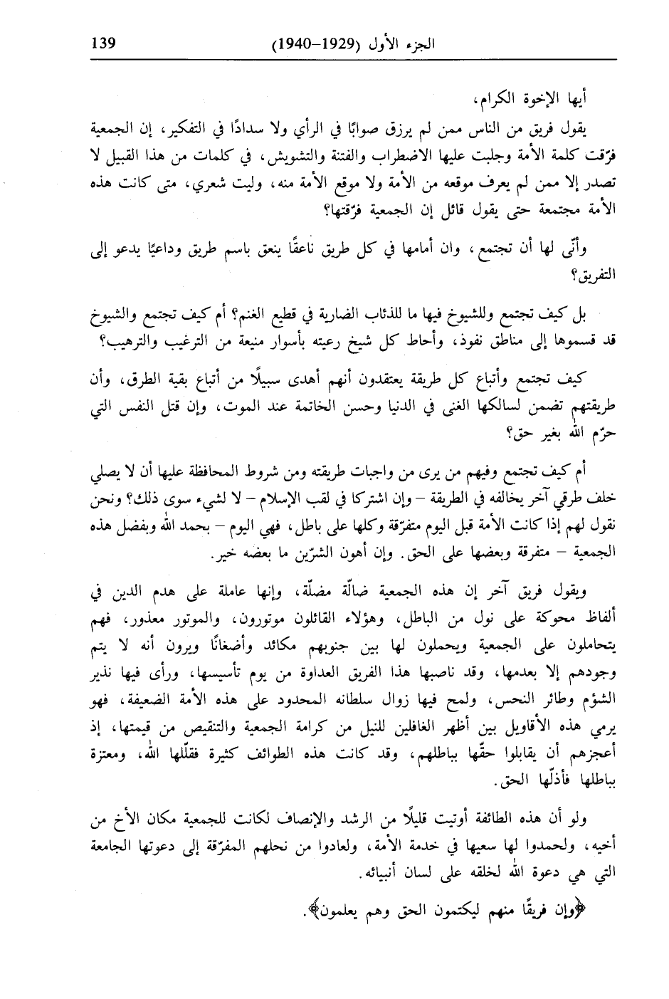 يقول فريق من الناس ممن لم يرزق صوابًا في الرأي ولا سدادًا في التفكير، إن الجمعية فرّقت كلمة الأمة وجلبت عليها الاضطراب والفتنة والتشويش، في كلمات من هذا القبيل لا تصدر إلا ممن لم يعرف موقعه من الأمة ولا موقع الأمة منه، وليت شعري، متى كانت هذه الأمة مجتمعة حتى يقول قائل إن الجمعية فرّقتها؟