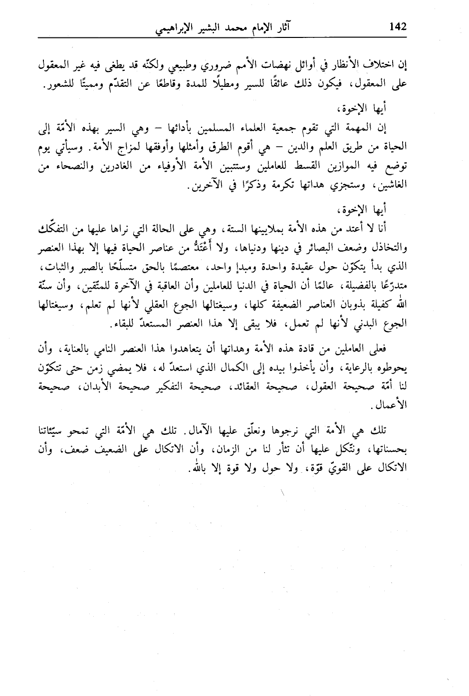 إن المهمة التي تقوم جمعية العلماء المسلمين بأدائها- وهي السير بهذه الأمّة إلى الحياة من طريق العلم والدين- هي أقوم الطرق وأمثلها وأوفقها لمزاج الأمة. وسيأتي يوم توضع فيه الموازين القسط للعاملين وستتبين الأمة الأوفياء من الغادرين والنصحاء من الغاشين، وستجزي هداتها تكرمة وذكرًا في الآخرين.