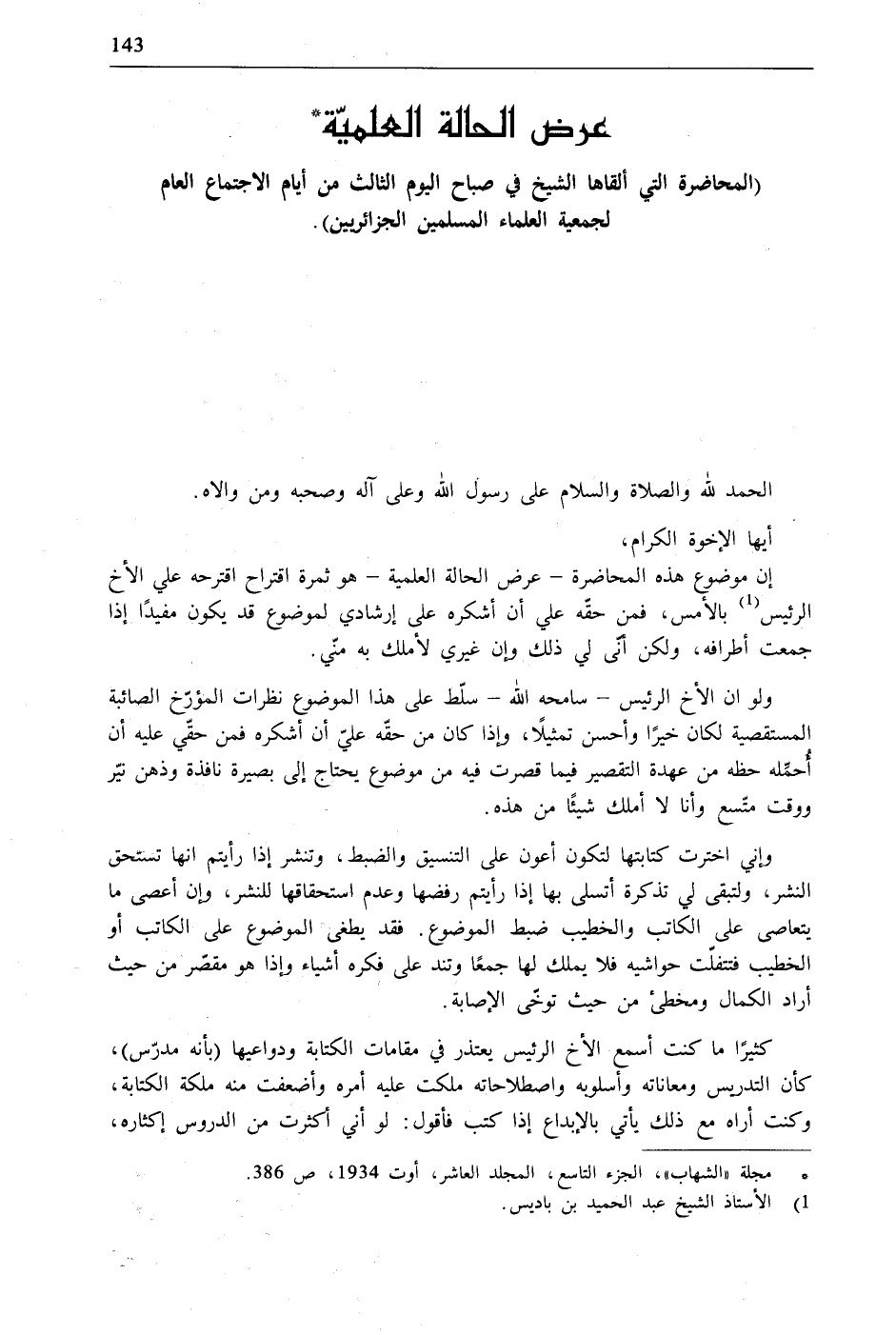(المحاظرة التي ألقاها الشيخ في صباح اليوم الثالث من أيام الاجتماع العام لجمعية العلماء المسلمين الجزائريين).