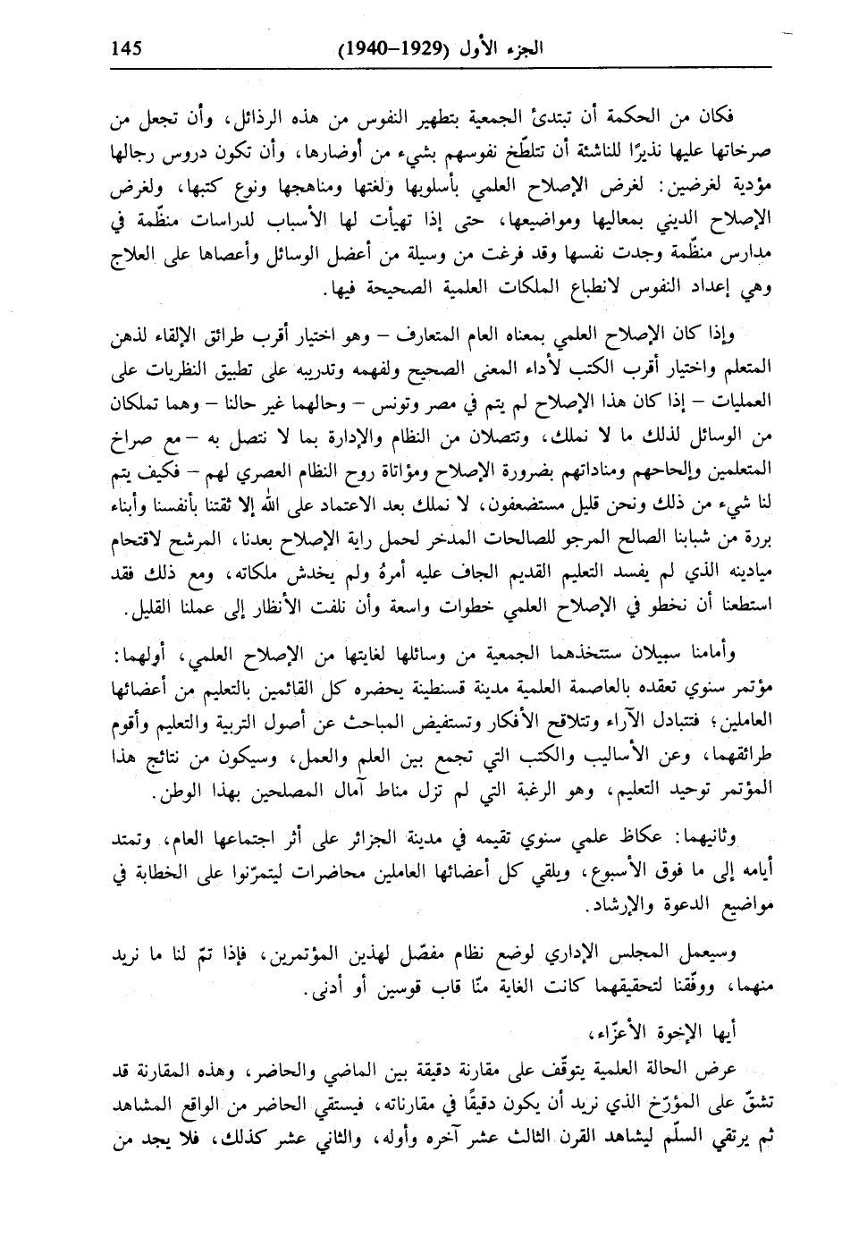 وأمامنا سبيلان ستتخذهما الجمعية من وسائلها لغايتها من الإصلاح العلمي، أولهما: مؤتمر سنوي تعقده بالعاصمة العلمية مدينة قسنطينة يحضره كل القائمين بالتعليم من أعضائها العاملين، فتتبادل الآراء وتتلاقح الأفكار وتستفيض المباحث عن أصول التربية والتعليم وأقوم طرائقهما، وعن الأساليب والكتب التي تجمع بين العلم والعمل، وسيكون من نتائج هذا المؤتمر توحيد التعليم، وهو الرغبة التي لم تزل مناط آمال المصلحين بهذا الوطن.