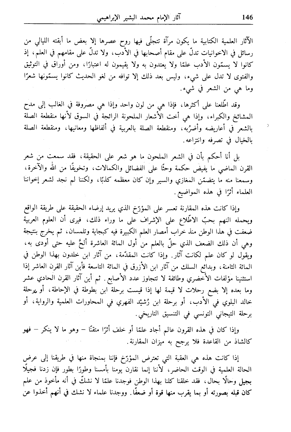 وإذا كانت هذه المقارنة تعسر على المؤرّخ الذي يريد إرضاء الحقيقة على طريقة الواقع ويحمله النهم بحبّ الاطّلاع على الإشراف على ما وراء ذلك، فيرى أن العلوم العربية ضعفت في هذا الوطن منذ خراب أمصار العلم الكبيرة فيه كبجاية وتلمسان، ثم يخرج بنتيجة وهي أن ذلك الضعف الذي حلّ بالعلم من أول المائة العاشرة ألحَّ عليه حتى أودى به، ويقول لو كان علم لكانت آثار. وإذا كانت المقلّمة، من آثار ابن خلدون بهذا الوطن في المائة الثامنة، وبدائع السلك من آثار ابن الأزرق في المائة التاسعة فأين آثار القرن العاشر إذا استثنينا مؤلفات الأخضري وطائفة لا تتجاوز عدد الأصابع. ثم أين آثار القرن الحادي عشر وما بعده إلا بضع رحلات لا قيمة لها إذا قيست برحلة ابن بطوطة في الإحاطة، أو برحلة خالد البلوي في الأدب، أو برحلة ابن رُشيْد الفهري في المحاورات العلمية والرواية، أو برحلة التيجاني التونسي في التنسيق التاريخي.