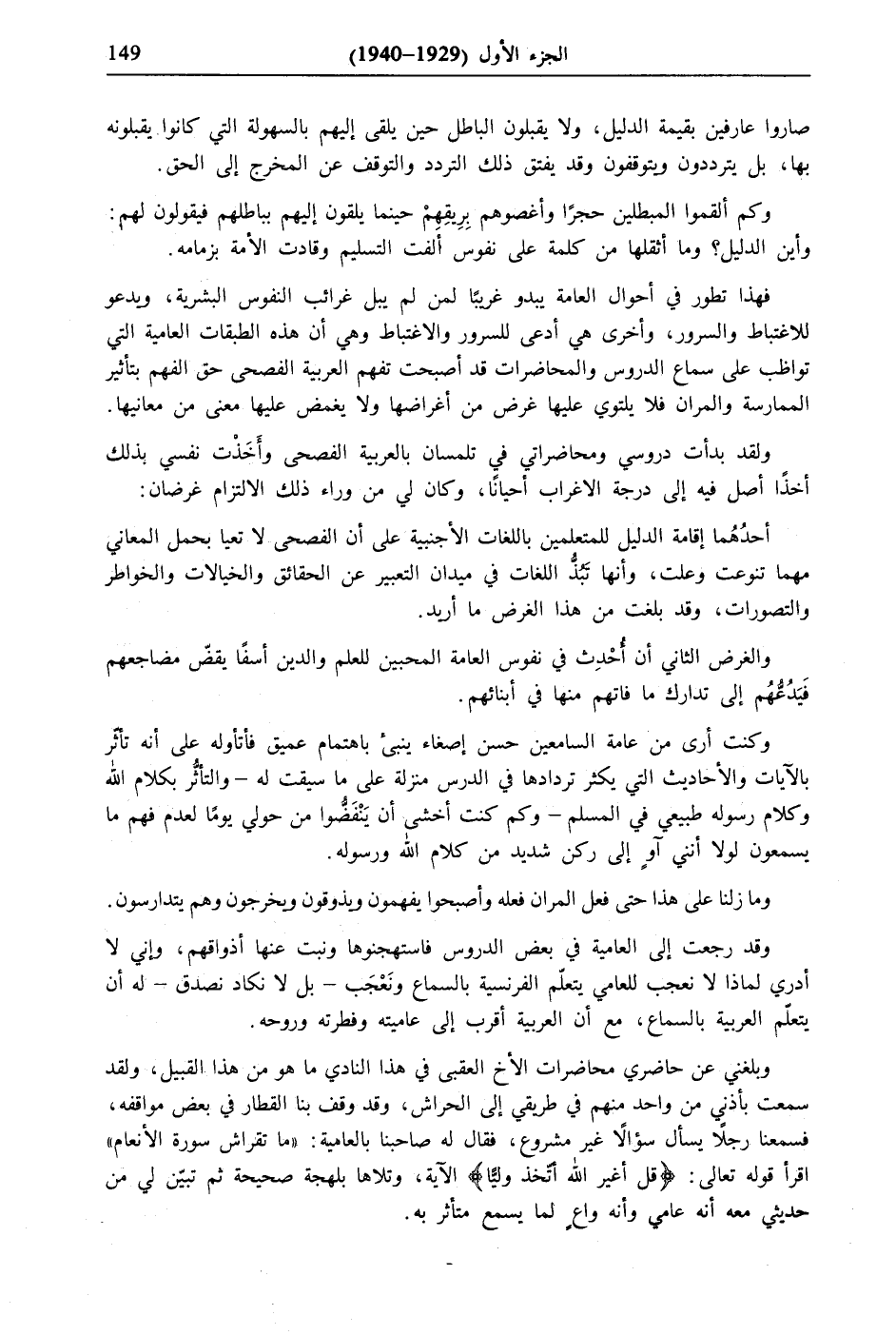فهذا تطور في أحوال العامة يبدو غريبًا لمن لم يبل غرائب النفوس البشرية، ويدعو للاغتباط والسرور، وأخرى هي أدعى للسرور والاغتباط وهي أن هذه الطبقات العامية التي تواظب على سماع الدروس والمحاضرات قد أصبحت تفهم العربية الفصحى حق الفهم بتأثير الممارسة والمران فلا يلتوي عليها غرض من أغراضها ولا يغمض عليها معنى من معانيها.
