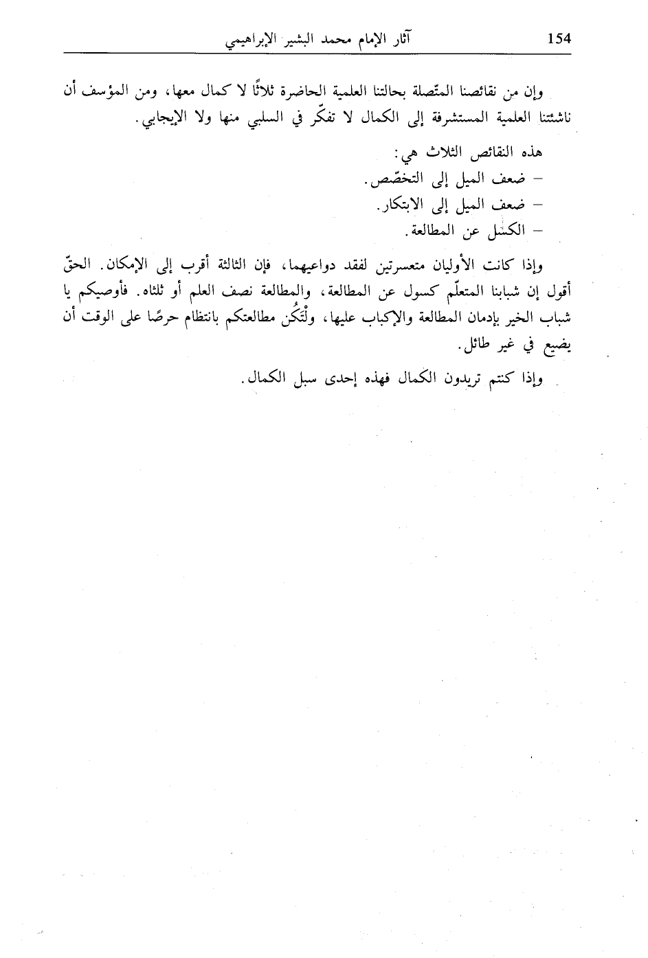 وإن من نقائصنا المتّصلة بحالتنا العلمية الحاضرة ثلاثًا لا كمال معها، ومن المؤسف أن ناشئتنا العلمية المستشرفة إلى الكمال لا تفكر في السلبي منها ولا الإيجابي.