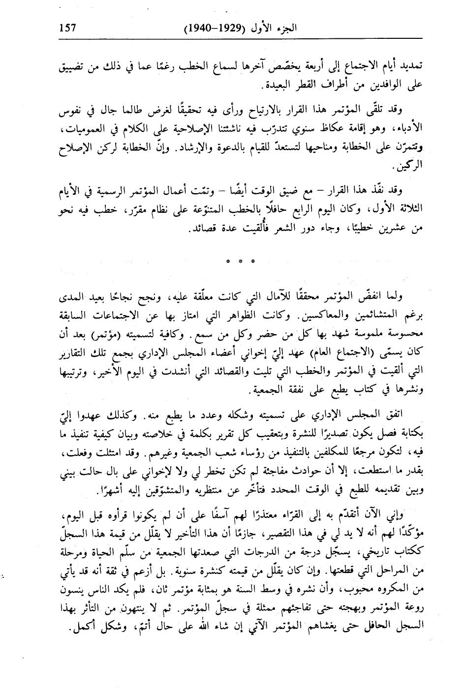 وإني الآن أتقدّم به إلى القرّاء معتذرًا لهم آسفًا على أن لم يكونوا قرأوه قبل اليوم، مؤكّدًا لهم أنه لا يد لي في هذا التقصير، جازمًا أن هذا التأخير لا يقلّل من قيمة هذا السجلّ ككتاب تاريخي، يسجّل درجة من الدرجات التي صعدتها الجمعية من سلّم الحياة ومرحلة من المراحل التي قطعتها. وإن كان يقفل من قيمته كنشرة سنوية. بل أزعم في ثقة أنه قد يأتي من المكروه محبوب، وأن نشره في وسط السنة هو بمثابة مؤتمر ثان، فلم يكد الناس ينسون روعة المؤتمر وبهجته حتى تفاجئهم ممثلة في سجلّ المؤتمر. ثم لا ينتهون من التأثر بهذا السجل الحافل حتى يغشاهم المؤتمر الآتي إن شاء الله على حال أتمّ، وشكل أكمل.