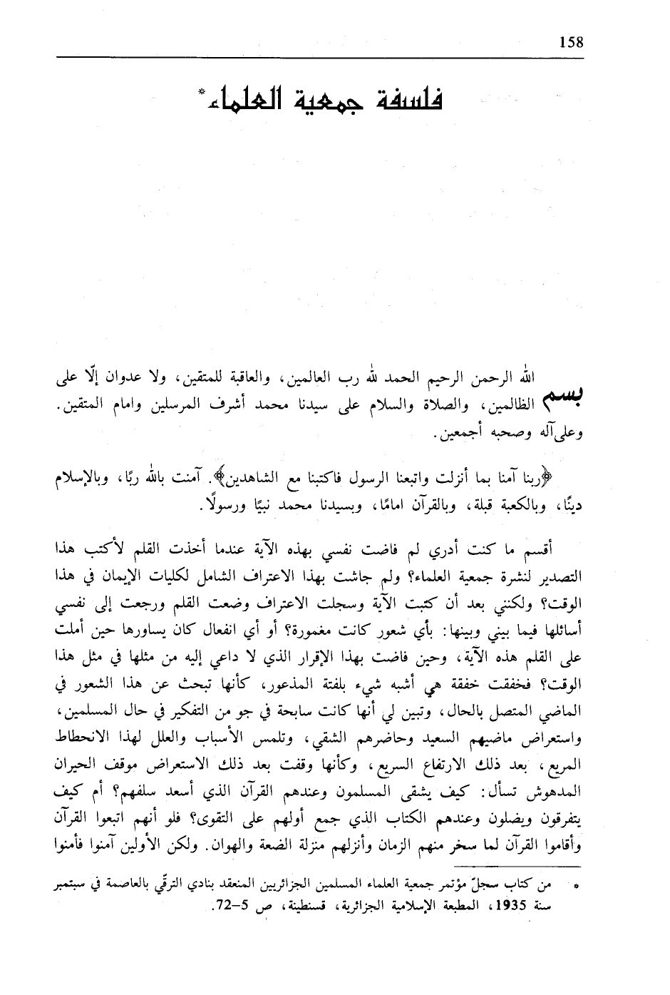 * من كتاب سجلّ مؤتمر جمعية العلماء المسلمين الجزائريين المنعقد بنادي الترقّي بالعاصمة في سبتمبر سنة 1935، المطبعة الإسلامية الجزائرية، قسنطينة، [ص:5 - 72].