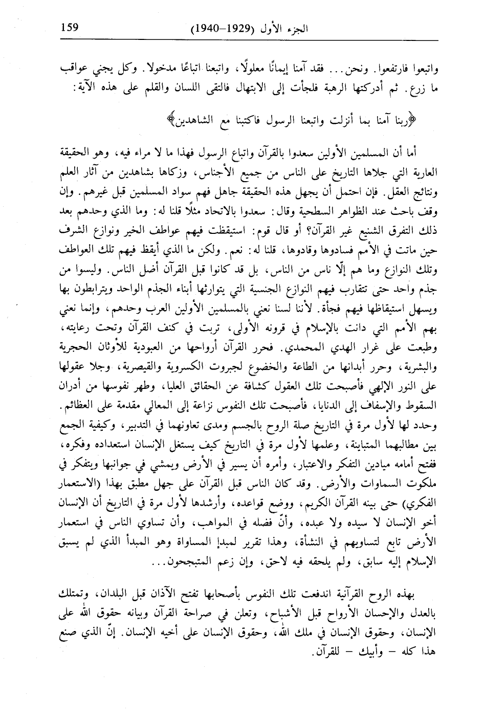 أما أن المسلمين الأولين سعدوا بالقرآن واتباع الرسول فهذا ما لا مراء فيه، وهو الحقيقة العارية التي جلاها التاريخ على الناس من جميع الأجناس، وزكاها بشاهدين من آثار العلم ونتائج العقل. فإن احتمل أن يجهل هذه الحقيقة جاهل فهم سواد المسلمين قبل غيرهم. وإن وقف باحث عند الظواهر السطحية وقال: سعدوا بالاتحاد مثلًا قلنا له: وما الذي وحدهم بعد ذلك التفرق الشنيع غير القرآن؟ أو قال قوم: استيقظت فيهم عواطف الخير ونوازع الشرف حين ماتت في الأمم فسادوها وقادوها، قلنا له: نعم. ولكن ما الذي أيقظ فيهم تلك العواطف وتلك النوازع وما هم إلّا ناس من الناس، بل قد كانوا قبل القرآن أضل الناس. وليسوا من جذم واحد حتى تتقارب فيهم النوازع الجنسية التي يتوارثها أبناء الجذم الواحد ويترابطون بها وسهل استيقاظها فيهم فجأة. لأننا لسنا نعني بالمسلمين الأولين العرب وحدهم، وإنما نعني بهم الأمم التي دانت بالإسلام في قرونه الأولى، تربت في كنف القرآن وتحت رعايته، وطبعت على غرار الهدي المحمدي. فحرر القرآن أرواحها من العبودية للأوثان الحجرية والبشرية، وحرر أبدانها من الطاعة والخضوع لجبروت الكسروية والقيصرية، وجلا عقولها على النور الإلهي فأصبحت تلك العقول كشافة عن الحقائق العليا، وطهر نفوسها من أدران السقوط والإسفاف إلى الدنايا، فأصبحت تلك النفوس نزاعة إلى المعالي مقدمة على العظائم. وحدد لها لأول مرة في التاريخ صلة الروح بالجسم ومدى تعاونهما في التدبير، وكيفية الجمع بين مطالبهما المتباينة، وعلمها لأول مرة في التاريخ كيف يستغل الإنسان استعداده وفكره، ففتح أمامه ميادين التفكر والاعتبار، وأمره أن يسير في الأرض ويمشي في جوانبها ويتفكر في ملكوت السماوات والأرض. وقد كان الناس قبل القرآن على جهل مطبق بهذا (الاستعمار الفكري) حتى بينه القرآن الكريم، ووضع قواعده، وأرشدها لأول مرة في التاريخ أن الإنسان أخو الإنسان لا سيده ولا عبده، وأنّ فضله في المواهب، وأن تساوي الناس في استعمار الأرض تابع لتساويهم في النشأة، وهذا تقرير لمبدإ المساواة وهو المبدأ الذي لم يسبق الإسلام إليه سابق، ولم يلحقه فيه لاحق، وإن زعم المتبجحون ...