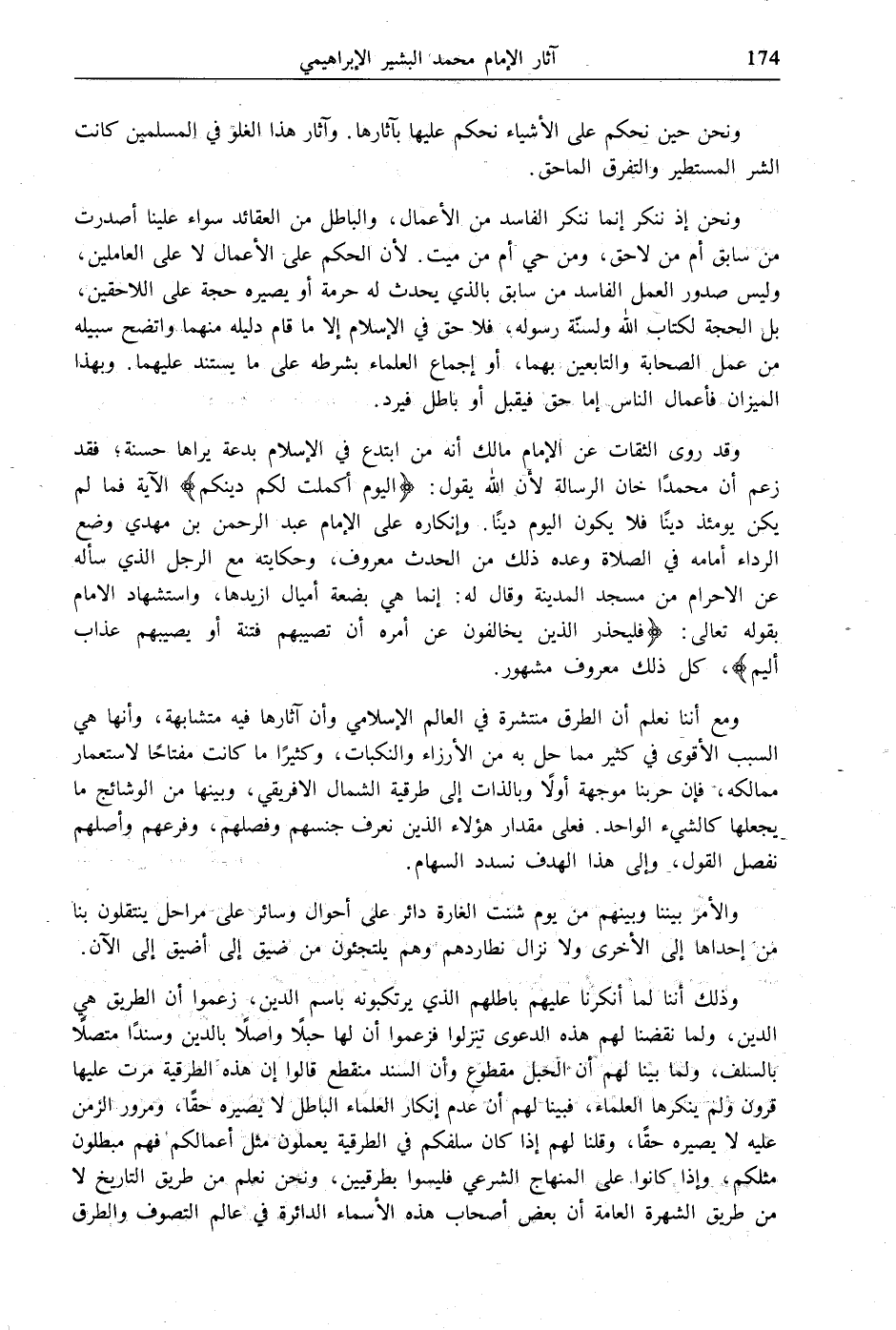 ومع أننا نعلم أن الطرق منتشرة في العالم الإسلامي وأن آثارها فيه متشابهة، وأنها هي السبب الأقوى في كثير مما حل به من الأرزاء والنكبات، وكثيرًا ما كانت مفتاحًا لاستعمار ممالكه، فإن حربنا موجهة أولًا وبالذات إلى طرقية الشمال الافريقي، وبينها من الوشائج ما يجعلها كالشيء الواحد. فعلى مقدار هؤلاء الذين نعرف جنسهم وفصلهم، وفرعهم وأصلهم نفصل القول، وإلى هذا الهدف نسدد السهام.