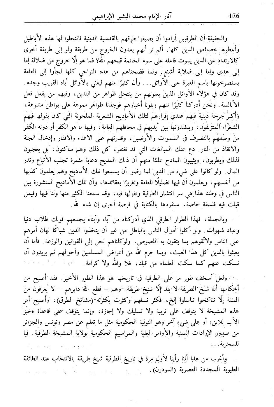 ولعل أسخف طور مر على الطرقية في تاريخها هو هذا الطور الأخير. فقد أصبح من أحكامها أن شيخ الطريقة لا يلد إلّا شيخ طريقة. وهم- قطع الله دابرهم- لا يعرفون من السنة إلّا تناكحوا تناسلوا إلخ، فكثر نسلهم وكثرت بكثرته (مشائخ الطرق)، وأصبح أمر هذه المشيخة لا يتوقف على تربية ولا تسليك ولا إجازة، وإنما يتوقف على قاعدة "خبز الأب للابن" أو على شيء آخر وهو التولية الحكومية مثل ما نعلم عن مصر وتونس والجزائر من صدور الإرادات السنية والأوامر العلية والمراسيم الحكومية بولاية المشيخة الطرقية. فيا للسخرية ...
