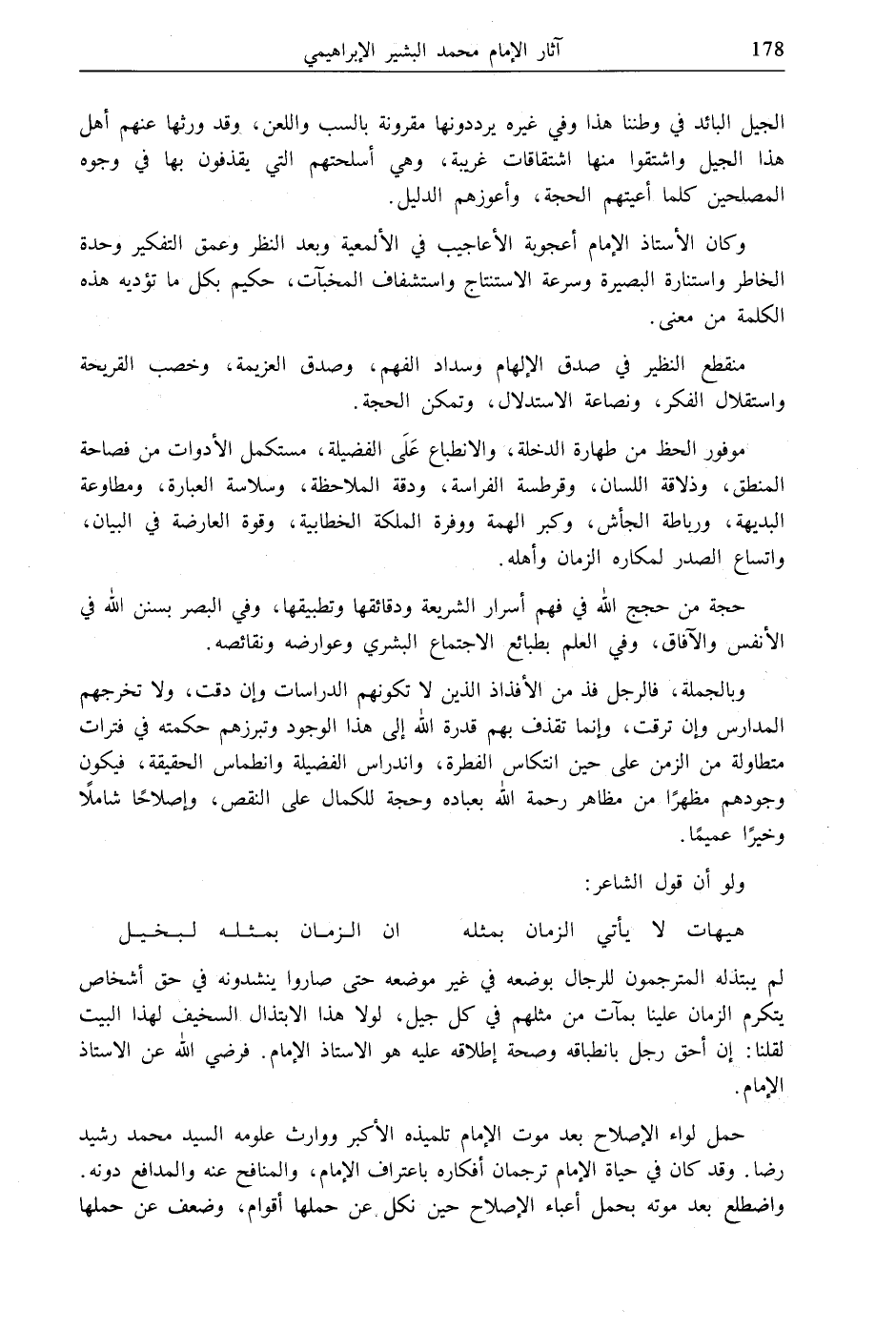وبالجملة، فالرجل فذ من الأفذاذ الذين لا تكونهم الدراسات وإن دقت، ولا تخرجهم المدارس وإن ترقت، وإنما تقذف بهم قدرة الله إلى هذا الوجود وتبرزهم حكمته في فترات متطاولة من الزمن على حين انتكاس الفطرة، واندراس الفضيلة وانطماس الحقيقة، فيكون وجودهم مظهرًا من مظاهر رحمة الله بعباده وحجة للكمال على النقص، وإصلاحًا شاملًا وخيرًا عميمًا.