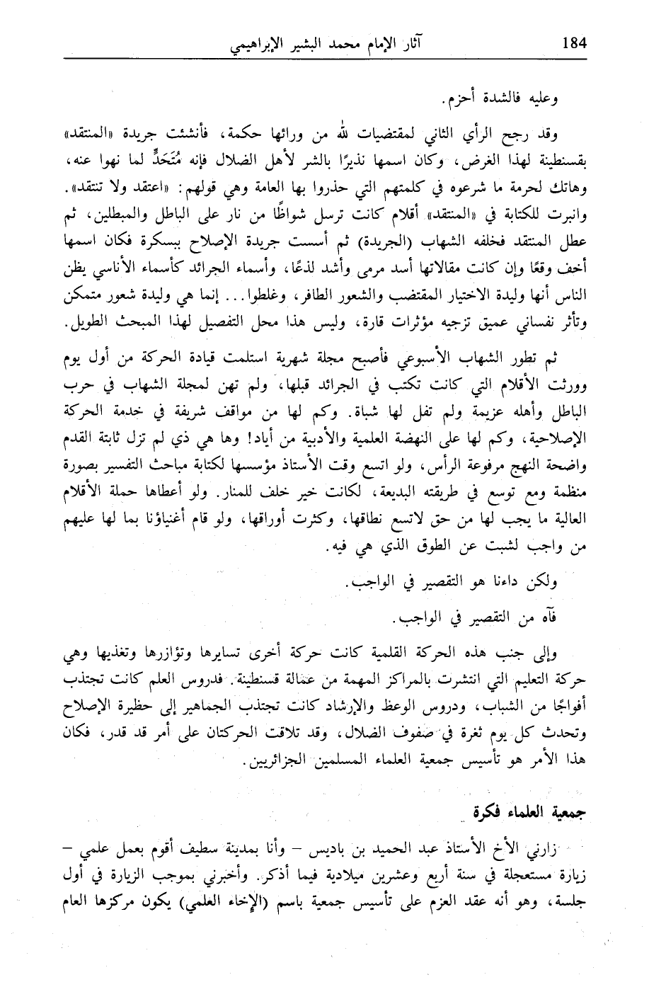 وقد رجح الرأي الثاني لمقتضيات لله من ورائها حكمة، فأنشئت جريدة "المنتقد" بقسنطينة لهذا الغرض، وكان اسمها نذيرًا بالشر لأهل الضلال فإنه مُتَحَدِّ لما نهوا عنه، وهاتك لحرمة ما شرعوه في كلمتهم التي حذروا بها العامة وهي قولهم: "اعتقد ولا تنتقد". وانبرت للكتابة في "المنتقد" أقلام كانت ترسل شواظًا من نار على الباطل والمبطلين، ثم عطل المنتقد فخلفه الشهاب (الجريدة) ثم أسست جريدة الإصلاح ببسكرة فكان اسمها أخف وقعًا وإن كانت مقالاتها أسد مرمى وأشد لذعًا، وأسماء الجرائد كأسماء الأناسي يظن الناس أنها وليدة الاختيار المقتضب والشعور الطافر، وغلطوا ... إنما هي وليدة شعور متمكن وتأثر نفساني عميق تزجيه مؤثرات قارة، وليس هذا محل التفصيل لهذا المبحث الطويل.