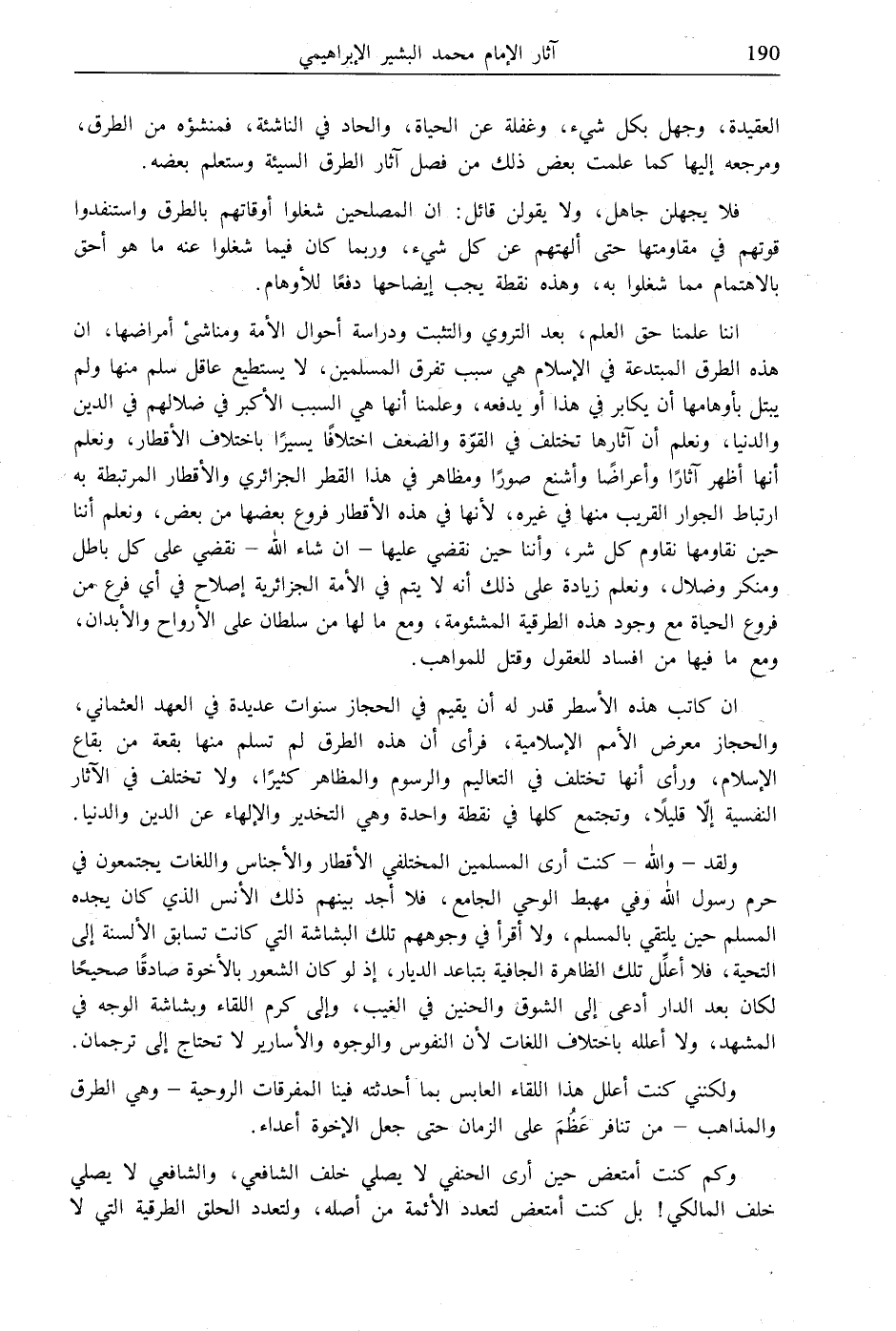 ولقد- والله- كنت أرى المسلمين المختلفي الأقطار والأجناس واللغات يجتمعون في حرم رسول الله وفي مهبط الوحي الجامع، فلا أجد بينهم ذلك الأنس الذي كان يجده المسلم حين يلتقي بالمسلم، ولا أقرأ في وجوههم تلك البشاشة التي كانت تسابق الألسنة إلى التحية، فلا أعلِّل تلك الظاهرة الجافية بتباعد الديار، إذ لو كان الشعور بالأخوة صادقًا صحيحًا لكان بعد الدار أدعى إلى الشوق والحنين في الغيب، وإلى كرم اللقاء وبشاشة الوجه في المشهد، ولا أعلله باختلاف اللغات لأن النفوس والوجوه والأسارير لا تحتاج إلى ترجمان. ولكني كنت أعلل هذا اللقاء العابس بما أحدثته فينا المفرقات الروحية- وهي الطرق والمذاهب- من تنافر عَظُمَ على الزمان حتى جعل الإخوة أعداء.