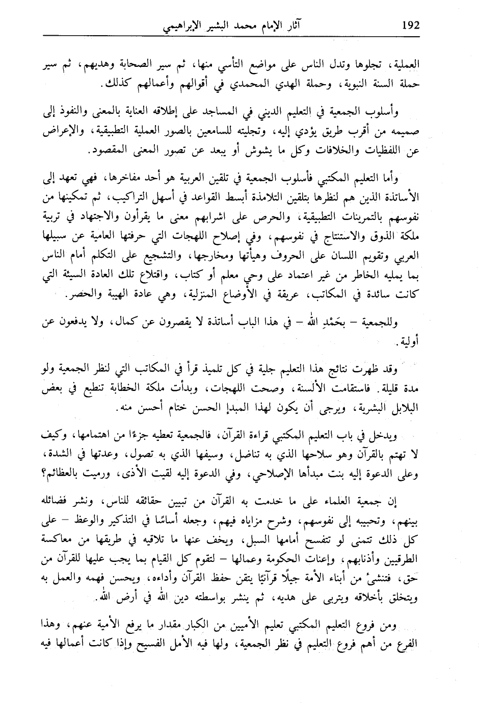 وأما التعليم المكتبي فأسلوب الجمعية في تلقين العربية هو أحد مفاخرها، فهي تعهد إلى الأساتذة الذين هم لنظرها بتلقين التلامذة أبسط القواعد في أسهل التراكيب، ثم تمكينها من نفوسهم بالتمرينات التطبيقية، والحرص على اشرابهم معنى ما يقرأون والاجتهاد في تربية ملكة الذوق والاستنتاج في نفوسهم، وفي إصلاح اللهجات التي حرفتها العامية عن سبيلها العربي وتقويم اللسان على الحروف وهيأتها ومخارجها، والتشجيع على التكلم أمام الناس بما يمليه الخاطر من غير اعتماد على وحي معلم أو كتاب، واقتلاع تلك العادة السيئة التي كانت سائدة في المكاتب، عريقة في الأوضاع المنزلية، وهي عادة الهيبة والحصر. وللجمعية- بحَمْدِ الله- في هذا الباب أساتذة لا يقصرون عن كمال، ولا يدفعون عن أولية.