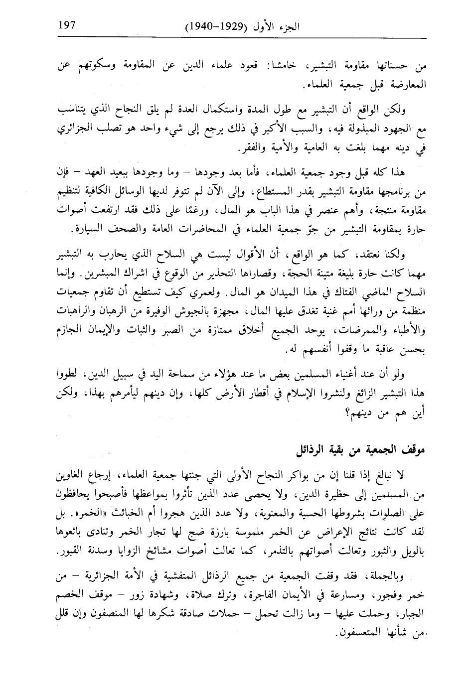 هذا كله قبل وجود جمعية العلماء، فأما بعد وجودها- وما وجودها ببعيد العهد- فإن من برنامجها مقاومة التبشير بقدر المستطاع، وإلى الآن لم تتوفر لديها الوسائل الكافية لتنظيم مقاومة منتجة، وأهم عنصر في هذا الباب هو المال، ورغمًا على ذلك فقد ارتفعت أصوات حارة بمقاومة التبشير من جوّ جمعية العلماء في المحاضرات العامة والصحف السيارة.
