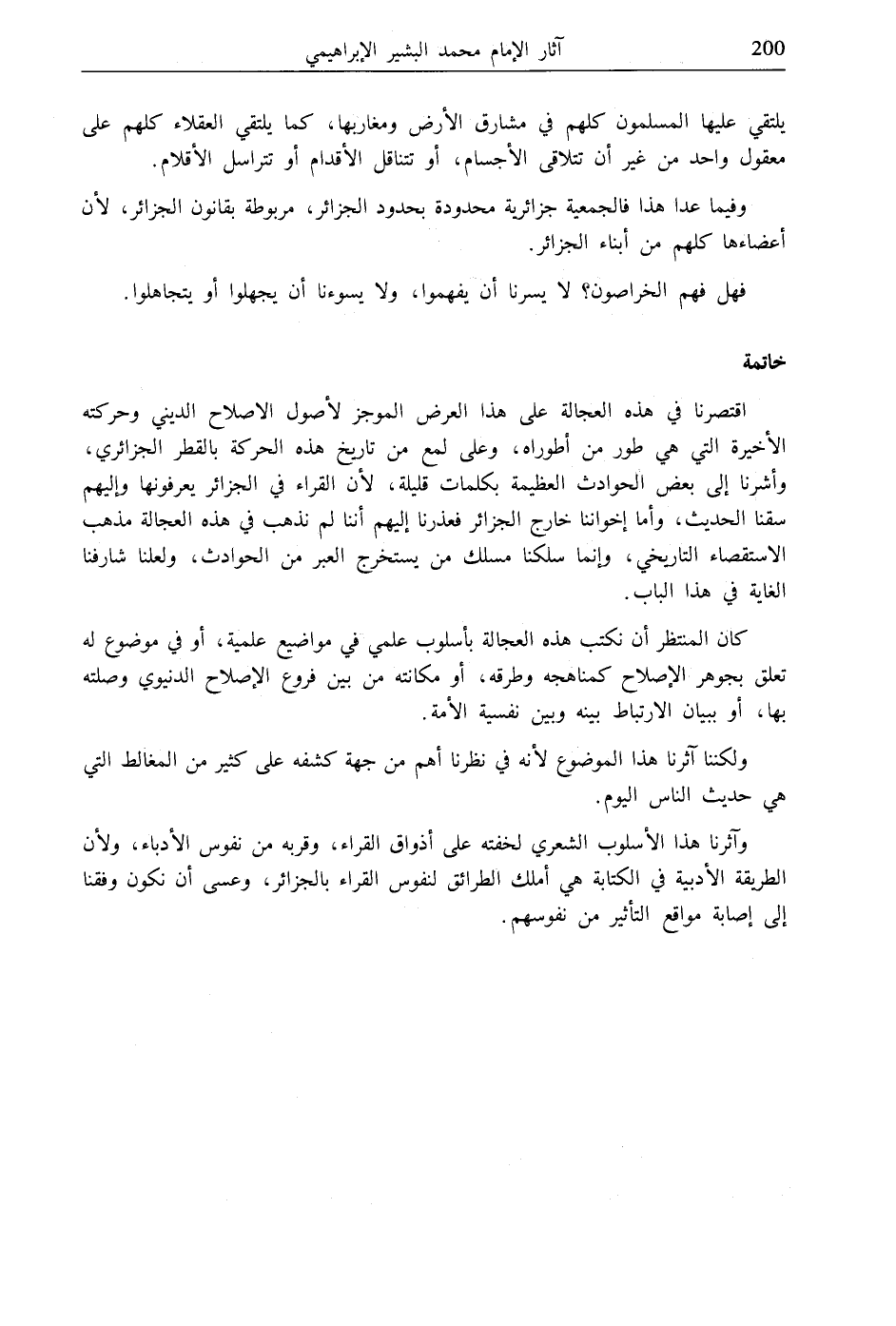اقتصرنا في هذه العجالة على هذا العرض الموجز لأصول الاصلاح الديني وحركته الأخيرة التي هي طور من أطوراه، وعلى لمع من تاريخ هذه الحركة بالقطر الجزائري، وأشرنا إلى بعض الحوادث العظيمة بكلمات قليلة، لأن القراء في الجزائر يعرفونها وإليهم سقنا الحديث، وأما إخواننا خارج الجزائر فعذرنا إليهم أننا لم نذهب في هذه العجالة مذهب الاستقصاء التاريخي، وإنما سلكنا مسلك من يستخرج العبر من الحوادث، ولعلنا شارفنا الغاية في هذا الباب.
