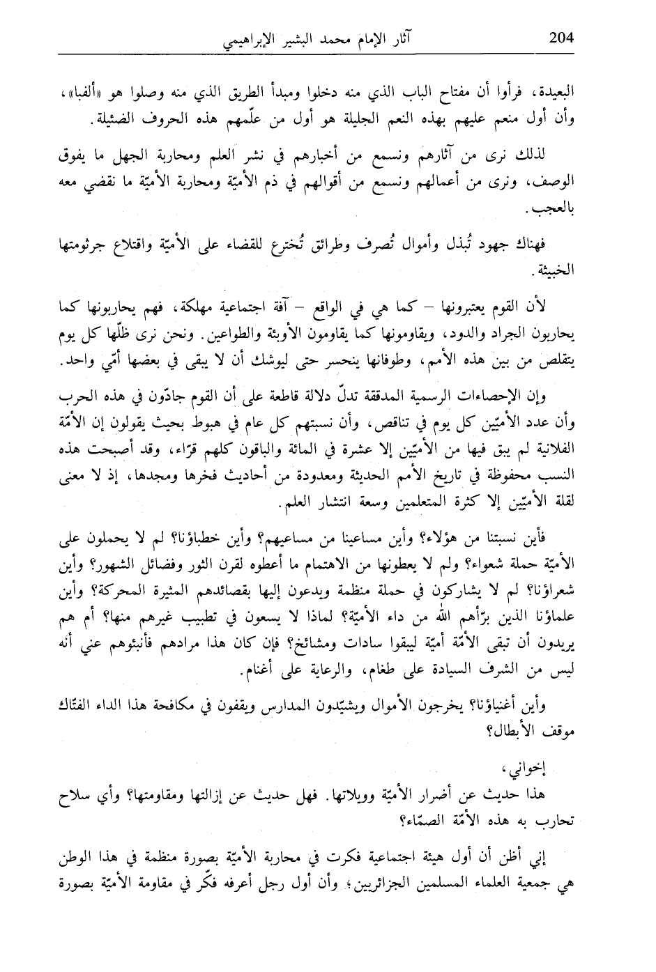 إني أظن أن أول هيئة اجتماعية فكرت في محاربة الأميّة بصورة منظمة في هذا الوطن هي جمعية العلماء المسلمين الجزائريين، وأن أول رجل أعرفه فكّر في مقاومة الأميّة بصورة