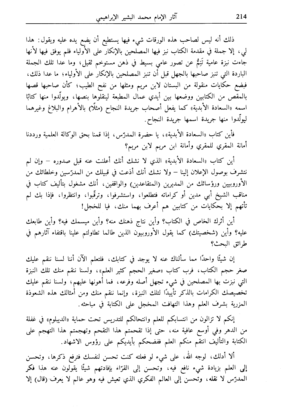 أين كتاب "السعادة الأبدية" الذي لا نشك أنك أعلنت عنه قبل صدوره- وإن لم نتشرف بوصول الإعلان إلينا- ولا نشك أنك أذعت في قبيلك من المدرّسين وخلطائك من الأوروبيين ورؤسائك من المديرين (المتقاعدين) والواقفين، أنك مشغول بتأليف كتاب في مناقب الشيخ أبي مدين أو كراماته فتطلعوا، واستشرفوا، وترقّبوا، وانتظروا، فإذا بك لم تأتهم إلا بحكايات من كتابين هم أعرف بهما منك، فيا للخجل!
