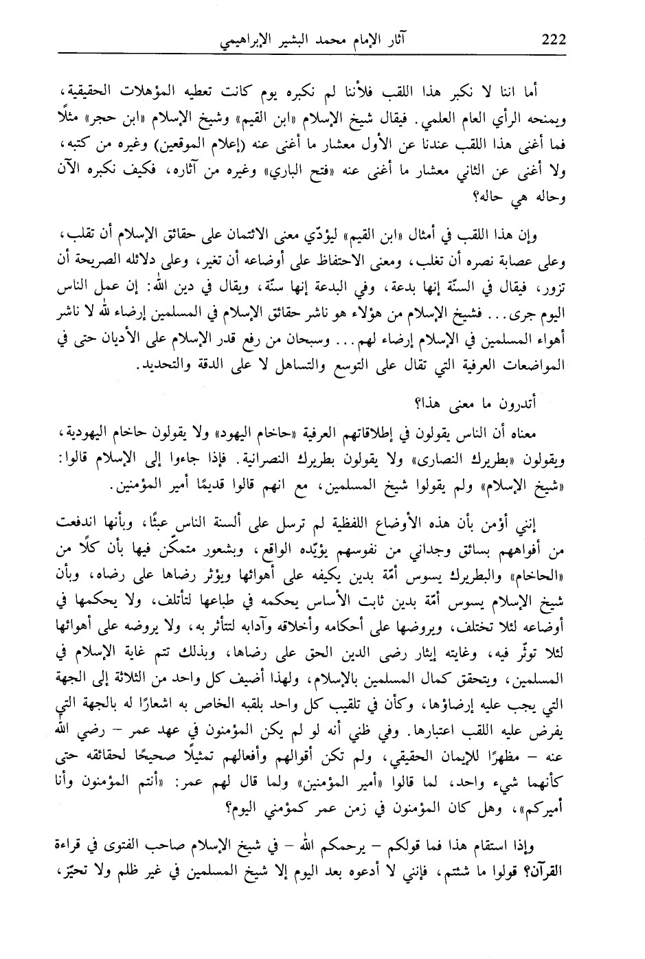 أما اننا لا نكبر هذا اللقب فلأننا لم نكبره يوم كانت تعطيه المؤهلات الحقيقية، ولمنحه الرأي العام العلمي. فيقال شيخ الإسلام "ابن القيم" وشيخ الإسلام "ابن حجر" مثلًا فما أغنى هذا اللقب عندنا عن الأول معشار ما أغنى عنه (إعلام الموقعين) وغيره من كتبه، ولا أغنى عن الثاني معشار ما أغنى عنه "فتح الباري" وغيره من آثاره، فكيف نكبره الآن وحاله هي حاله؟