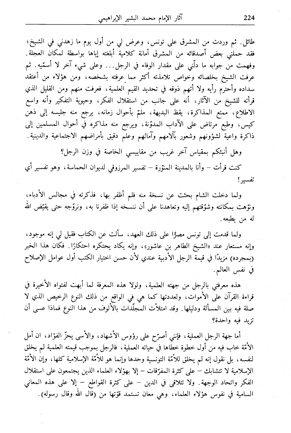 طائل. ثم وردت من المشرق على تونس، وعرض لي من أول يوم ما زهدني في الشيخ، فقد حملني بعض أصدقائه من المشرق أمانة كلامية أبلغته إياها بواسطة لمكان العجلة. وفهمت من جوابه ما دلّني على مقدار الوفاء في الرجل ... وعلى شيء آخر لا أسمّيه. ثم عرفت الشيخ بخلصائه وخواص تلامذته أكثر مما عرفته بشخصه، ومن هؤلاء من أعتقد سداده وأحترم رأيه ولا أتهم ذوقه في تحديد القيم العلمية، فعرفت منهم ومن القليل الذي قرأته للشيخ من الآثار، أنه على جانب من استقلال الفكر، وحيوية التفكير وأنه واسع الاطلاع، ممتع المذاكرة، يقظ البديهة، ملمّ بأحوال زمانه، يرجع منه جليسه إلى ذهن كيس، وطبع مرتاض على الآداب المدوّنة، ويرجع منه مذاكره في أحوال المسلمين إلى ذاكرة واعية لشؤونهم وشعور بآلامهم وآمالهم وعلم دقيق بأمراضهم الاجتماعية والدينية.