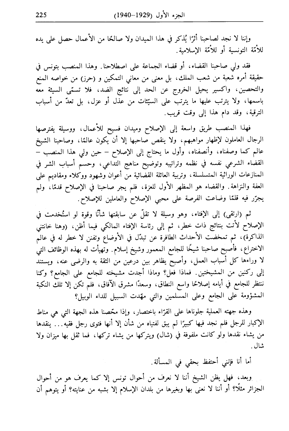 فهذا المنصب طريق واسعة إلى الإصلاح وميدان فسيح للأعمال، ووسيلة يفترصها الرجال العاملون لإظهار مواهبهم، ولا ينقص صاحبها إلا أن يكون عالمًا، وصاحبنا الشيخ عالم كما وصفناه، وأنصفناه، وأول ما يحتاج إلى الإصلاح- حين ولي هذا المنصب- القضاء الشرعي نفسه في نظمه وتراتيبه وتوضيح مناهج التداعي، وحسم أسباب الشر في المنازعات الوراثية المتسلسلة، وتربية العائلة القضائية من أعوان وشهود ووكلاء ومقاديم على العفة والنزاهة. والقضاء هو المظهر الأول للعزة، فلم يجر صاحبنا في الإصلاح قدمًا، ولم يجرّر فيه قلمًا وضاعت الفرصة على محبي الإصلاح والعاملين للإصلاح.