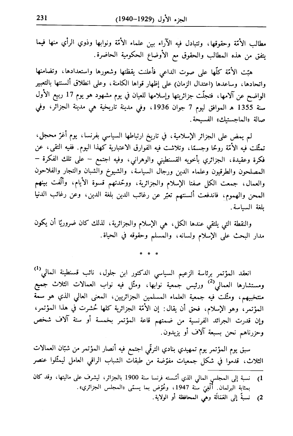 لم يمض على الجزائر الإسلامية، في تاريخ ارتباطها السياسي بفرنسا، يوم أغرّ محجل، تمثّلت فيه الأمّة روحًا وجسمًا، وتلاشت فيه الفوارق الاعتبارية كهذا اليوم. ففيه التقى، عن فكرة وعقيدة، الجزائري بأخويه القسنطيني والوهراني، وفيه اجتمع- على تلك الفكرة- المصلحون والطرقيون وعلماء الدين ورجال السياسة، والشيوخ والشبان والتجار والفلاحون والعمال، جمعت الكل صفتا الإسلام والجزائرية، ووحّدتهم قسوة الأيام، وألّفت بينهم المحن والهموم، فاندفعت ألسنتهم تعبّر عن رغائب الدين بلغة الدين، وعن رغائب الدنيا بلغة السياسة.
