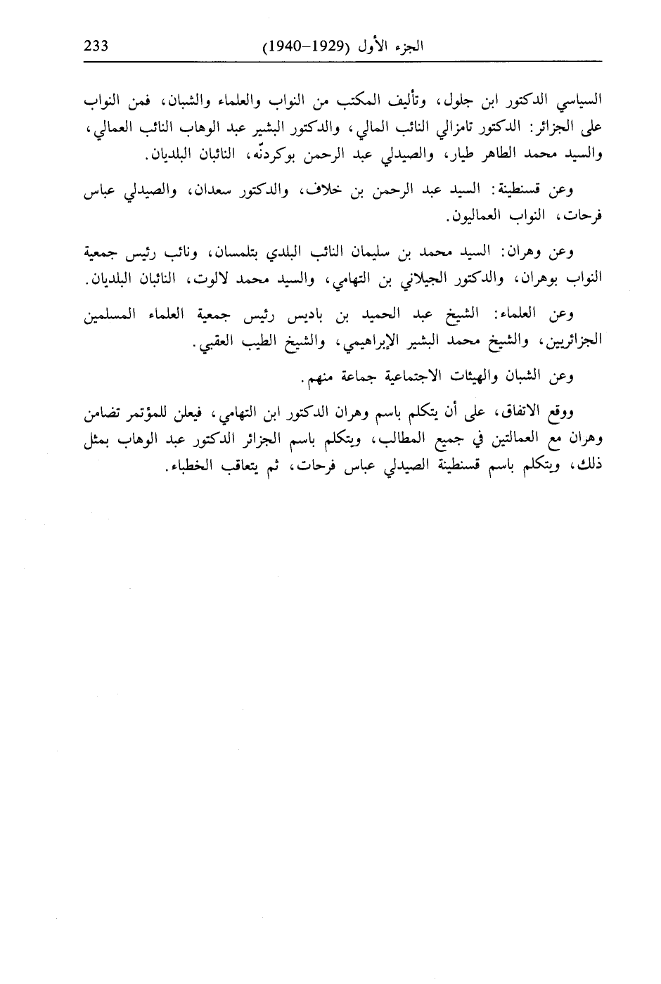 وعن وهران: السيد محمد بن سليمان النائب البلدي بتلمسان، ونائب رئيس جمعية النواب بوهران، والدكتور الجيلاني بن التهامي، والسيد محمد لالوت، النائبان البلديان.