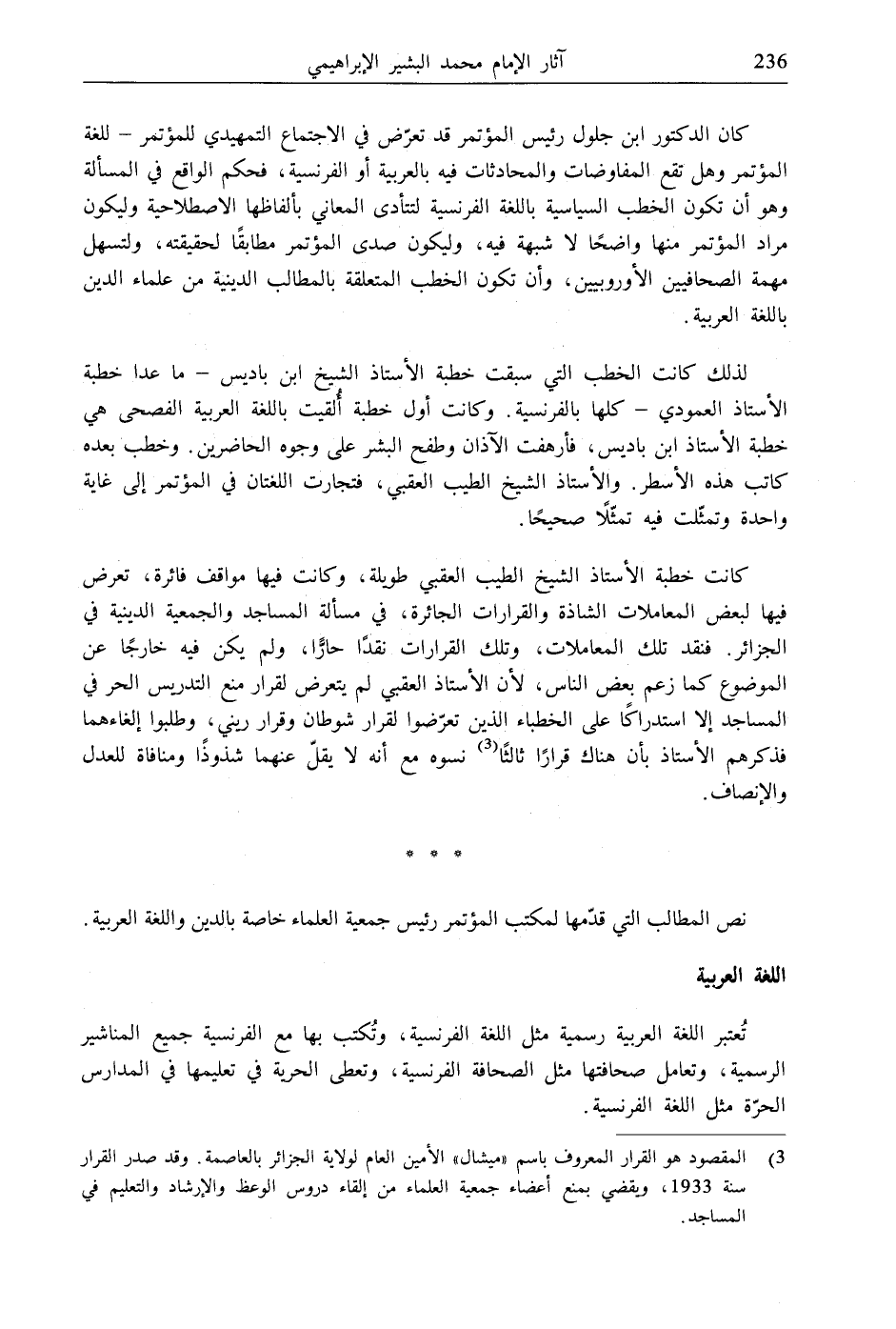 3) المقصود هو القرار المعروف باسم "ميشال" الأمين العام لولاية الجزائر بالعاصمة. وقد صدر القرار سنة 1933، ويقضي بمنع أعضاء جمعية العلماء من إلقاء دروس الوعظ والإرشاد والتعليم في المساجد.