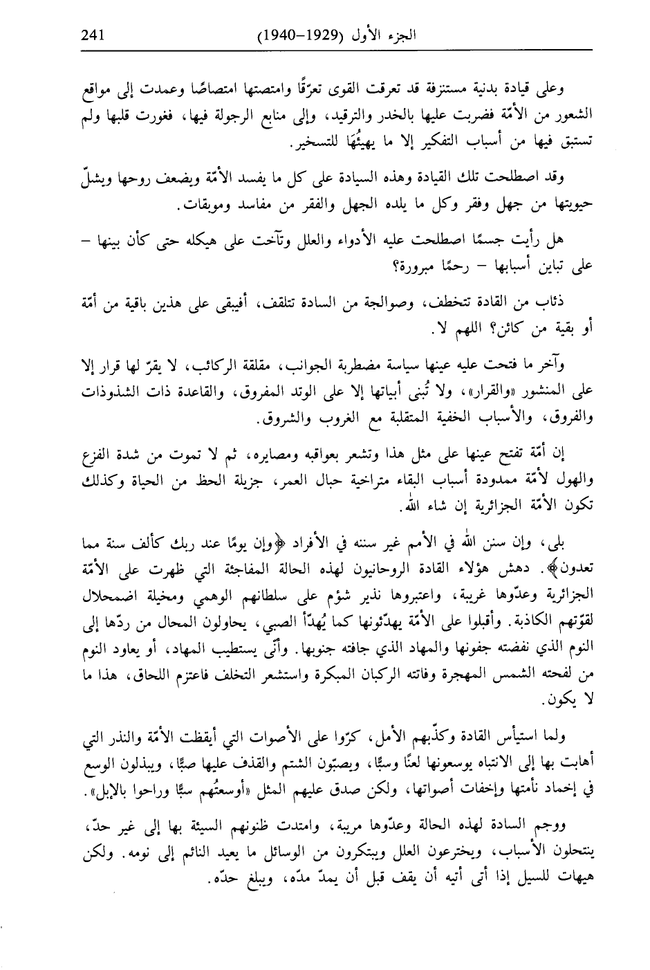 بلى، وإن سنن الله في الأمم غير سننه في الأفراد {وَإِنَّ يَوْمًا عِنْدَ رَبِّكَ كَأَلْفِ سَنَةٍ مِمَّا تَعُدُّونَ}. دهش هؤلاء القادة الروحانيون لهذه الحالة المفاجئة التي ظهرت على الأمّة الجزائرية وعدّوها غريبة، واعتبروها نذير شؤم على سلطانهم الوهمي ومخيلة اضمحلال لقوّتهم الكاذبة. وأقبلوا على الأمّة يهدّئونها كما يهدّأ الصبي، يحاولون المحال من ردّها إلى النوم الذي نفضته جفونها والمهاد الذي جافته جنوبها. وأنّى يستطيب المهاد، أو يعاود النوم من لفحته الشمس المهجرة وفاتته الركبان المبكرة واستشعر التخلف فاعتزم اللحاق، هذا ما لا يكون.