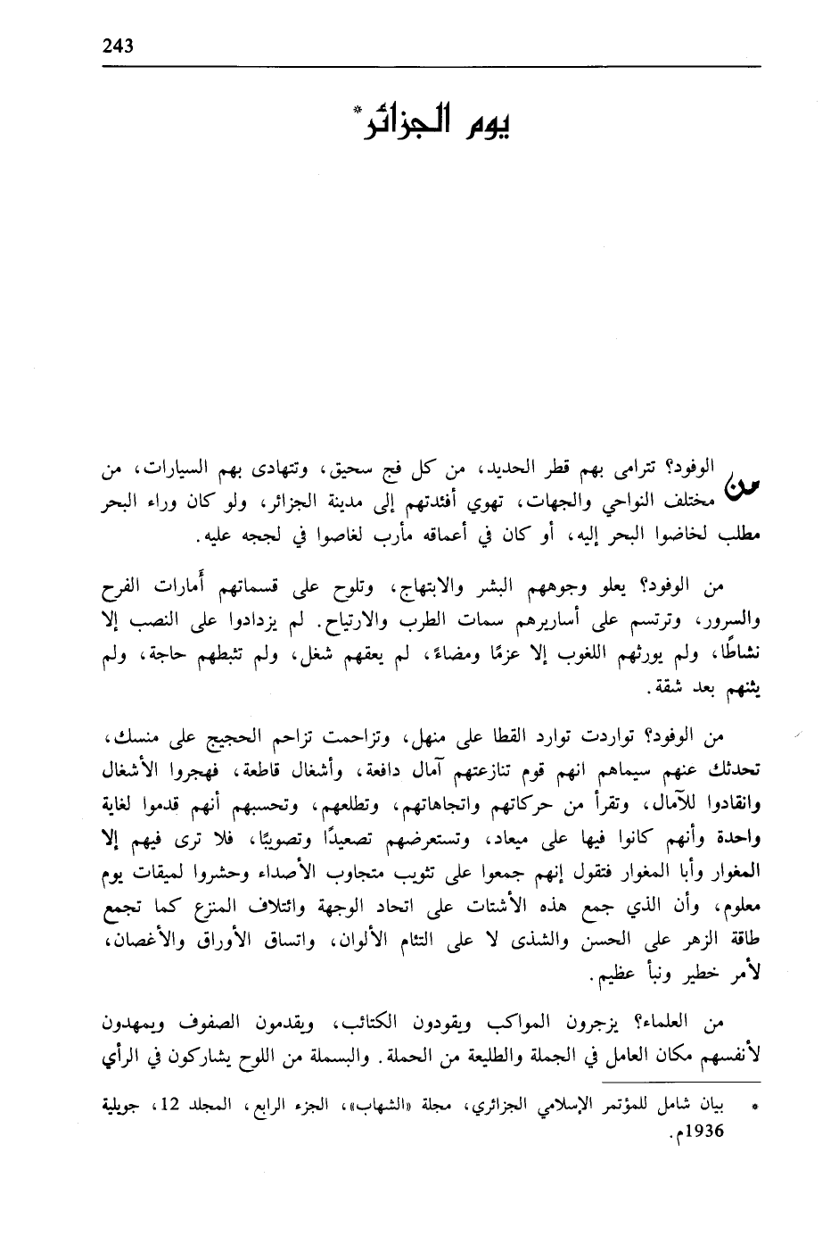 من الوفود؟ تترامى بهم قطر الحديد، من كل فج سحيق، وتتهادى بهم السيارات، من مختلف النواحي والجهات، تهوي أفئدتهم إلى مدينة الجزائر، ولو كان وراء البحر مطلب لخاضوا البحر إليه، أو كان في أعماقه مأرب لغاصوا في لججه عليه.