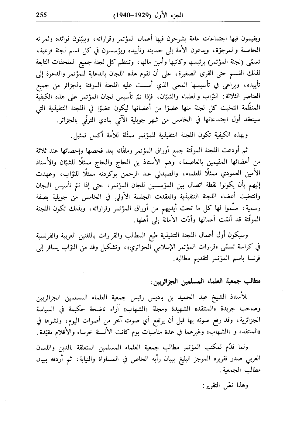 ولما قدّم لمكتب المؤتمر مطالب جمعية العلماء المسلمين المتعلقة بالدين واللسان العربي صدر تقريره الموجز البليغ ببيان رأيه الخاص في المساواة والنيابة، ثم أردفه ببيان مطالب الجمعية.