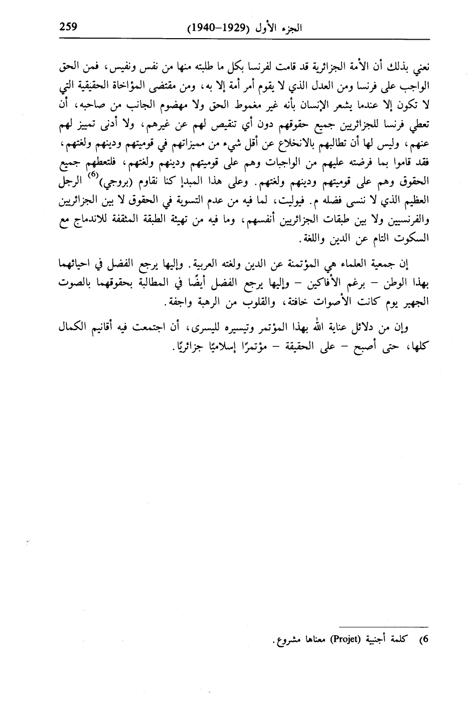 نعني بذلك أن الأمة الجزائرية قد قامت لفرنسا بكل ما طلبته منها من نفس ونفيس، فمن الحق الواجب على فرنسا ومن العدل الذي لا يقوم أمر أمة إلا به، ومن مقتضى المؤاخاة الحقيقية التي لا تكون إلا عندما يشعر الإنسان بأنه غير مغموط الحق ولا مهضوم الجانب من صاحبه، أن تعطي فرنسا للجزائريين جميع حقوقهم دون أي تنقيص لهم عن غيرهم، ولا أدنى تمييز لهم عنهم، وليس لها أن تطالبهم بالانخلاع عن أقل شيء من مميزاتهم في قوميتهم ودينهم ولغتهم، فقد قاموا بما فرضته عليهم من الواجبات وهم على قوميتهم ودينهم ولغتهم، فلتعطهم جميع الحقوق وهم على قوميتهم ودينهم ولغتهم. وعلى هذا مبدإ كنا نقاوم (بروجي) (6) الرجل العظيم الذي لا ننسى فضله م. فيوليت، لما فيه من عدم التسوية في الحقوق لا بين الجزائريين والفرنسيين ولا بين طبقات الجزائريين أنفسهم، ومما فيه من تهيئة الطبقة المثقفة للاندماج مع السكوت التام عن الدين واللغة.