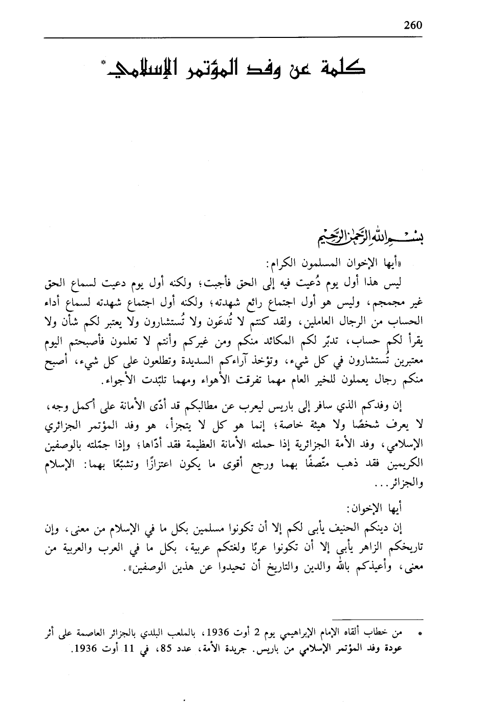 إن وفدكم الذي سافر إلى باريس ليعرب عن مطالبكم قد أدّى الأمانة على أكمل وجه، لا يعرف شخصًا ولا هيئة خاصة، إنما هو كل لا يتجزأ، هو وفد المؤتمر الجزائري الإسلامي، وفد الأمة الجزائرية إذا حملته الأمانة العظيمة فقد أدّاها، وإذا جمّلته بالوصفين الكريمين فقد ذهب متّصفًا بهما ورجع أقوى ما يكون اعتزازًا وتشبّعًا بهما: الإسلام والجزائر ...