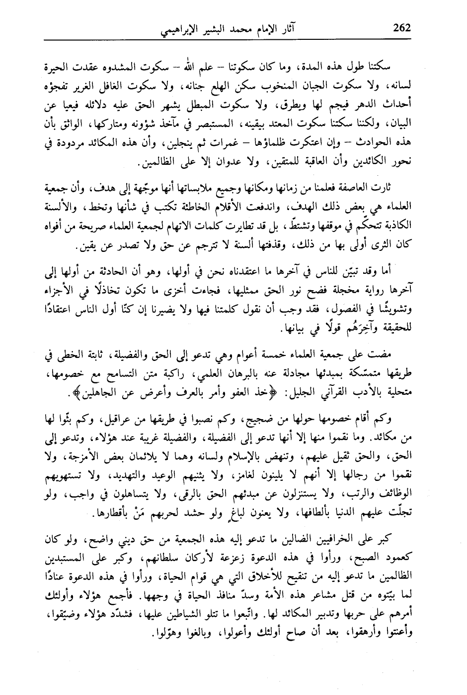 مضت على جمعية العلماء خمسة أعوام وهي تدعو إلى الحق والفضيلة، ثابتة الخطى في طريقها متمسّكة بمبدئها مجادلة عنه بالبرهان العلمي، راكبة متن التسامح مع خصومها، متحلية بالأدب القرآني الجليل: {خُذِ الْعَفْوَ وَأْمُرْ بِالْعُرْفِ وَأَعْرِضْ عَنِ الْجَاهِلِينَ}.