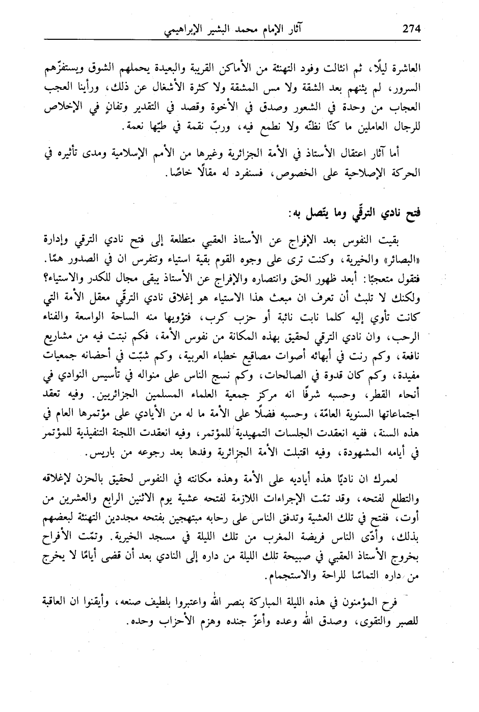 بقيت النفوس بعد الإفراج عن الأستاذ العقبي متطلعة إلى فتح نادي الترقي وإدارة "البصائر" والخيرية، وكنت ترى على وجوه القوم بقية استياء وتتفرس ان في الصدور همًا. فتقول متعجبًا: أبعد ظهور الحق وانتصاره والإفراج عن الأستاذ يبقى مجال للكدر والاستياء؟ ولكنك لا تلبث أن تعرف ان مبعث هذا الاستياء هو إغلاق نادي الترقّي معقل الأمة التي كانت تأوي إليه كلما نابت نائبة أو حزب كرب، فتؤويها منه الساحة الواسعة والفناء الرحب، وان نادي الترقي لحقيق بهذه المكانة من نفوس الأمة، فكم نبتت فيه من مشاريع نافعة، وكم رنت في أبهائه أصوات مصاقيع خطباء العربية، وكم شبّت في أحضانه جمعيات مفيدة، وكم كان قدوة في الصالحات، وكم نسج الناس على منواله في تأسيس النوادي في أنحاء القطر، وحسبه شرفًا أنه مركز جمعية العلماء المسلمين الجزائريين. وفيه تعقد اجتماعاتها السنوية العامّة، وحسبه فضلًا على الأمة ما له من الأيادي على مؤتمرها العام في هذه السنة، ففيه انعقدت الجلسات التمهيدية للمؤتمر، وفيه انعقدت اللجنة التنفيذية للمؤتمر في أيامه المشهودة، وفيه اقتبلت الأمة الجزائرية وفدها بعد رجوعه من باريس.