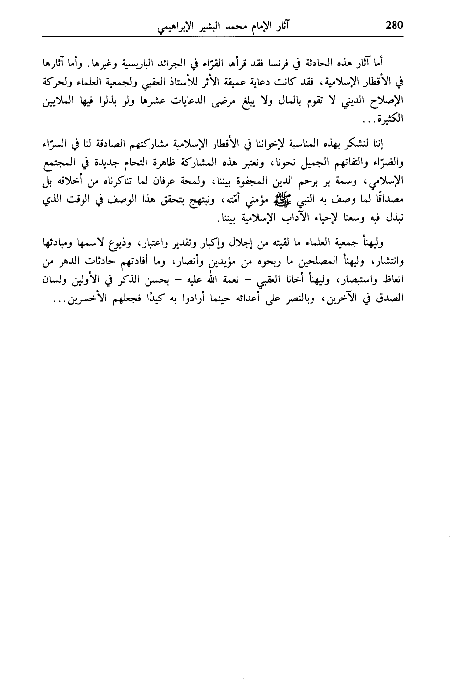 وليهنأ جمعية العلماء ما لقيته من إجلال وإكبار وتقدير واعتبار، وذيوع لاسمها ومبادئها وانتشار، وليهنأ المصلحين ما ربحوه من مؤيدين وأنصار، وما أفادتهم حادثات الدهر من اتعاظ واستبصار، وليهنأ أخانا العقبي- نعمة الله عليه- بحسن الذكر في الأولين ولسان الصدق في الآخرين، وبالنصر على أعدائه حينما أرادوا به كيدًا فجعلهم الأخسرين ...