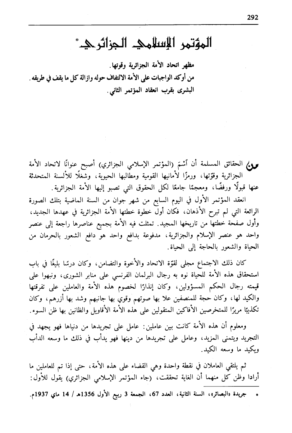 انعقد المؤتمر الأول في اليوم السابع من شهر جوان من السنة الماضية بتلك الصورة الرائعة التي لم تبرح الأذهان، فكان أول خطوة خطتها الأمة الجزائرية في عهدها الجديد، وأول صفحة خطتها من تاريخها المجيد. تمثلت فيه الأمة بجميع عناصرها راجعة إلى عنصر واحد هو عنصر الإسلام والجزائرية، مدفوعة بدافع واحد هو دافع الشعور بالحرمان من الحياة والشعور بالحاجة إلى الحياة.