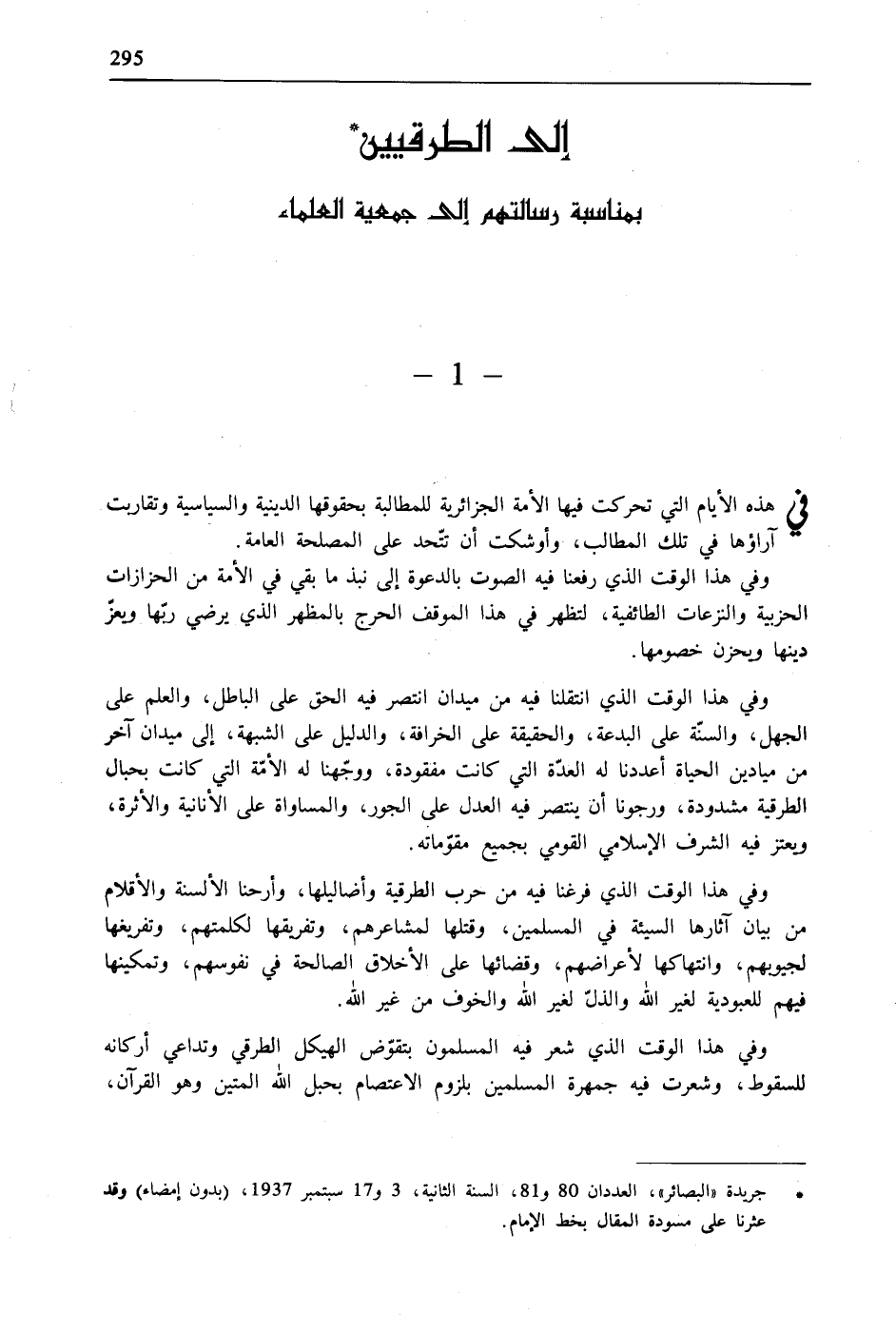 * جريدة "البصائر"، العددان 80 و 81، السنة الثانية، 3 و 17 سبتمبر 1937، (بدون إمضاء) وقد عثرنا على مسودة المقال بخط الإمام.