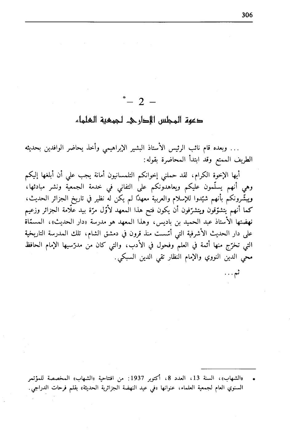 أيها الإخوة الكرام، لقد حملني إخوانكم التلمسانيون أمانة يجب علي أن أبلغها إليكم وهي أنهم يسلّمون عليكم ويعاهدونكم على التفاني في خدمة الجمعية ونشر مبادئها، ويبشّرونكم بأنهم شيّدوا للإسلام والعربية معهدًا لم يكن له نظير في تاريخ الجزائر الحديث، كما أنهم يتشوّقون ويتشرّفون أن يكون فتح هذا المعهد لأوّل مرّة بيد علامة الجزائر وزعيم نهضتها الأستاذ عبد الحميد بن باديس، وهذا المعهد هو مدرسة «دار الحديث»، المسمّاة على دار الحديث الأشرفية التي أسّست منذ قرون في دمشق الشام، تلك المدرسة التاريخية التي تخرّج منها أئمة في العلم وفحول في الأدب، والتي كان من مدرّسيها الإمام الحافظ محي الدين النووي والإمام النظار تقي الدين السبكي.